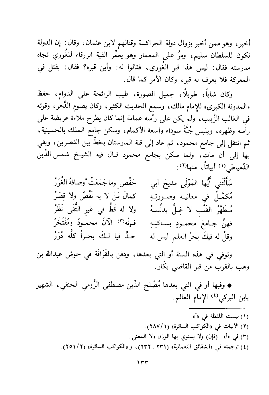 وفيها أو في التي بعدها مصلح الدّين مصطفى الرّومي الحنفي، الشهير بابن البركي [4] الإمام العالم.