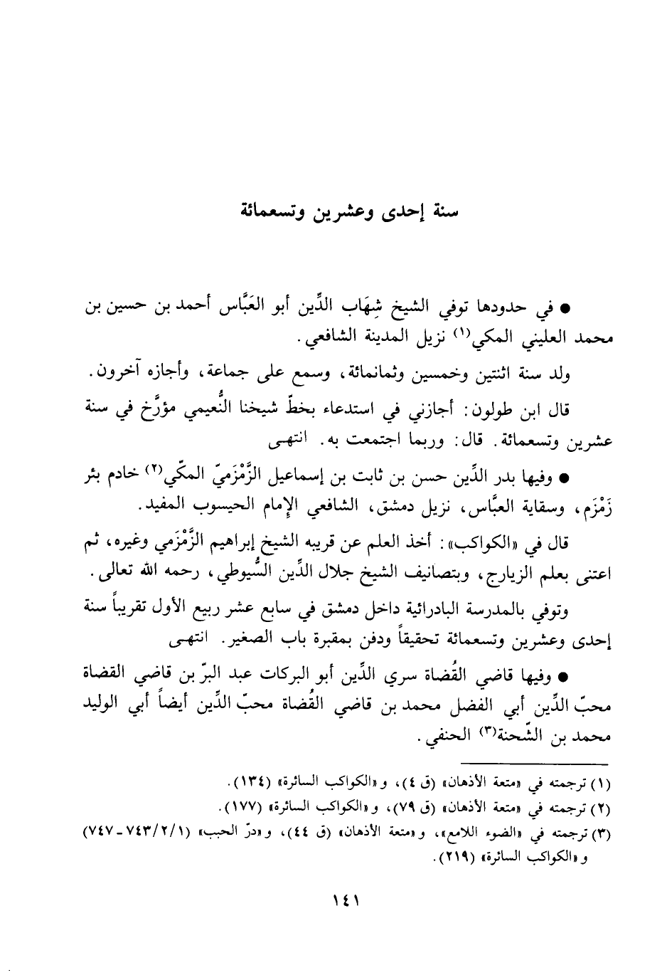 [3] ترجمته في «الضوء اللامع» ، و «متعة الأذهان» (ق 44) ، و «درّ الحبب» (1/ 2/ 743- 747) و «الكواكب السائرة» (219) .