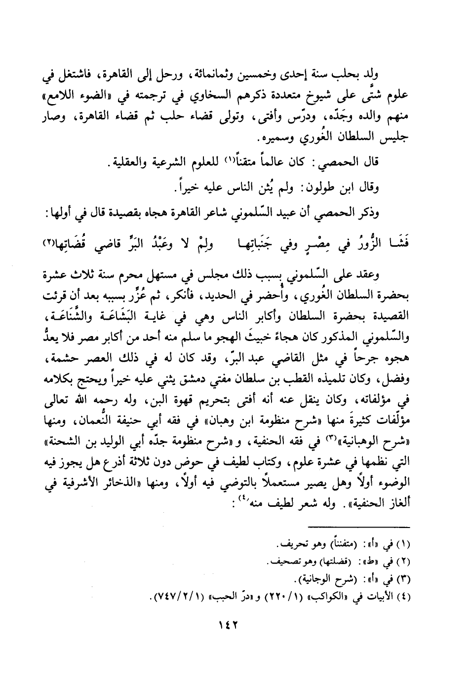 وعقد على السّلموني بسبب ذلك مجلس في مستهل محرم سنة ثلاث عشرة بحضرة السلطان الغوريّ، وأحضر في الحديد، فأنكر، ثم عزّر بسببه بعد أن قرئت القصيدة بحضرة السلطان وأكابر الناس وهي في غاية البشاعة والشّناعة، والسّلموني المذكور كان هجاء خبيث الهجو ما سلم منه أحد من أكابر مصر فلا يعدّ هجوه جرحا في مثل القاضي عبد البرّ، وقد كان له في ذلك العصر حشمة، وفضل، وكان تلميذه القطب بن سلطان مفتي دمشق يثني عليه خيرا ويحتج بكلامه في مؤلفاته، وكان ينقل عنه أنه أفتى بتحريم قهوة البن، وله رحمه الله تعالى مؤلّفات كثيرة منها «شرح منظومة ابن وهبان» في فقه أبي حنيفة النّعمان، ومنها «شرح الوهبانية» [3] في فقه الحنفية، و «شرح منظومة جدّه أبي الوليد بن الشحنة» التي نظمها في عشرة علوم، وكتاب لطيف في حوض دون ثلاثة أذرع هل يجوز فيه الوضوء، أولا وهل يصير مستعملا بالتوضي فيه أولا، ومنها «الذخائر الأشرفية في ألغار الحنفية» . وله شعر لطيف منه [4] :