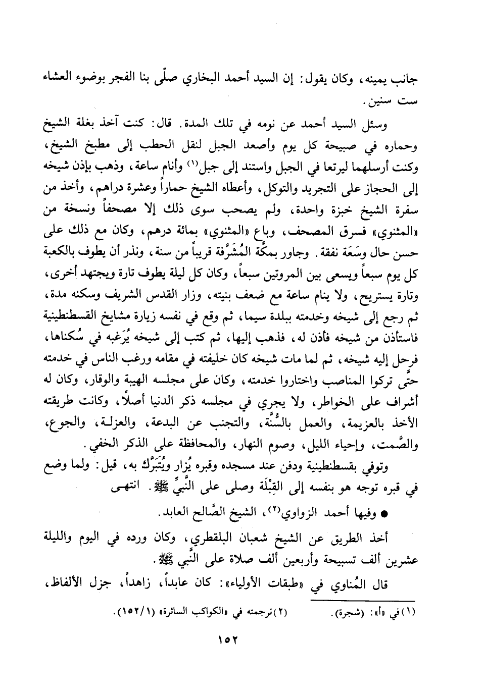 وسئل السيد أحمد عن نومه في تلك المدة. قال: كنت آخذ بغلة الشيخ وحماره في صبيحة كل يوم وأصعد الجبل لنقل الحطب إلى مطبخ الشيخ، وكنت أرسلهما ليرتعا في الجبل واستند إلى جبل [1] وأنام ساعة، وذهب بإذن شيخه إلى الحجاز على التجريد والتوكل، وأعطاه الشيخ حمارا وعشرة دراهم، وأخذ من سفرة الشيخ خبزة واحدة، ولم يصحب سوى ذلك إلا مصحفا ونسخة من «المثنوي» فسرق المصحف، وباع «المثنوي» بمائة درهم، وكان مع ذلك على حسن حال وسعة نفقة. وجاور بمكّة المشرّفة قريبا من سنة، ونذر أن يطوف بالكعبة كل يوم سبعا ويسعى بين المروتين سبعا، وكان كل ليلة يطوف تارة ويجتهد أخرى، وتارة يستريح، ولا ينام ساعة مع ضعف بنيته، وزار القدس الشريف وسكنه مدة، ثم رجع إلى شيخه وخدمته ببلدة سيما، ثم وقع في نفسه زيارة مشايخ القسطنطينية فاستأذن من شيخه فأذن له، فذهب إليها، ثم كتب إلى شيخه يرغبه في سكناها، فرحل إليه شيخه، ثم لما مات شيخه كان خليفته في مقامه ورغب الناس في خدمته حتّى تركوا المناصب واختاروا خدمته، وكان على مجلسه الهيبة والوقار، وكان له أشراف على الخواطر، ولا يجري في مجلسه ذكر الدنيا أصلا، وكانت طريقته الأخذ بالعزيمة، والعمل بالسّنّة، والتجنب عن البدعة، والعزلة، والجوع، والصّمت، وإحياء الليل، وصوم النهار، والمحافظة على الذكر الخفي.