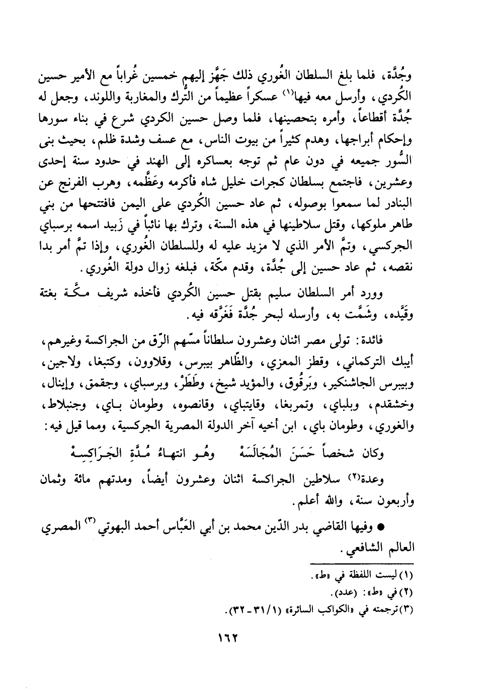 وجدّة، فلما بلغ السلطان الغوري ذلك جهّز إليهم خمسين غرابا مع الأمير حسين الكردي، وأرسل معه فيها [1] عسكرا عظيما من التّرك والمغاربة واللوند، وجعل له جدّة أقطاعا، وأمره بتحصينها، فلما وصل حسين الكردي شرع في بناء سورها وإحكام أبراجها، وهدم كثيرا من بيوت الناس، مع عسف وشدة ظلم، بحيث بنى السّور جميعه في دون عام ثم توجه بعساكره إلى الهند في حدود سنة إحدى وعشرين، فاجتمع بسلطان كجرات خليل شاه فأكرمه وعظّمه، وهرب الفرنج عن البنادر لما سمعوا بوصوله، ثم عاد حسين الكردي على اليمن فافتتحها من بني طاهر ملوكها، وقتل سلاطينها في هذه السنة، وترك بها نائبا في زبيد اسمه برسباي الجركسي، وتمّ الأمر الذي لا مزيد عليه له وللسلطان الغوري، وإذا تمّ أمر بدا نقصه، ثم عاد حسين إلى جدّة، وقدم مكّة، فبلغه زوال دولة الغوري.