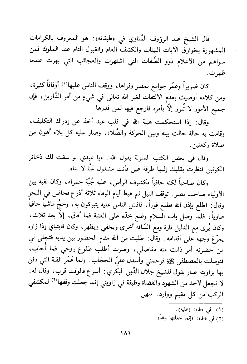 قال الشيخ عبد الرؤوف المناوي في «طبقاته» : هو المعروف بالكرامات المشهورة بخوارق الآيات البينات والكشف العام والقبول التام عند الملوك فمن سواهم من الأعلام ذوو الصّفات التي اشتهرت والعجائب التي بهرت عند ما ظهرت.