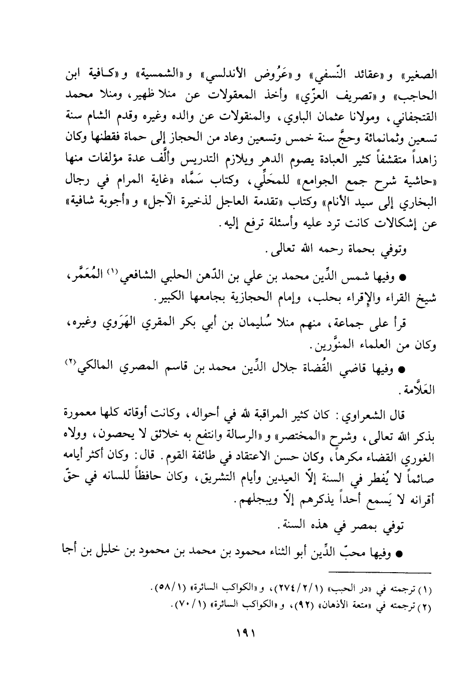 الصغير» و «عقائد النّفسي» و «عروض الأندلسي» و «الشمسية» و «كافية ابن الحاجب» و «تصريف العزّي» وأخذ المعقولات عن منلا ظهير، ومنلا محمد القتجفاني، ومولانا عثمان الباوي، والمنقولات عن والده وغيره وقدم الشام سنة تسعين وثمانمائة، وحجّ سنة خمس وتسعين وعاد من الحجاز إلى حماة فقطنها وكان زاهدا متقشفا كثير العبادة يصوم الدهر ويلازم التدريس وألّف عدة مؤلفات منها «حاشية شرح جمع الجوامع» للمحلّي، وكتاب سمّاه «غاية المرام في رجال البخاري إلى سيد الأنام» وكتاب «تقدمة العاجل لذخيرة الآجل» و «أجوبة شافية» عن إشكالات كانت ترد عليه وأسئلة ترفع إليه.