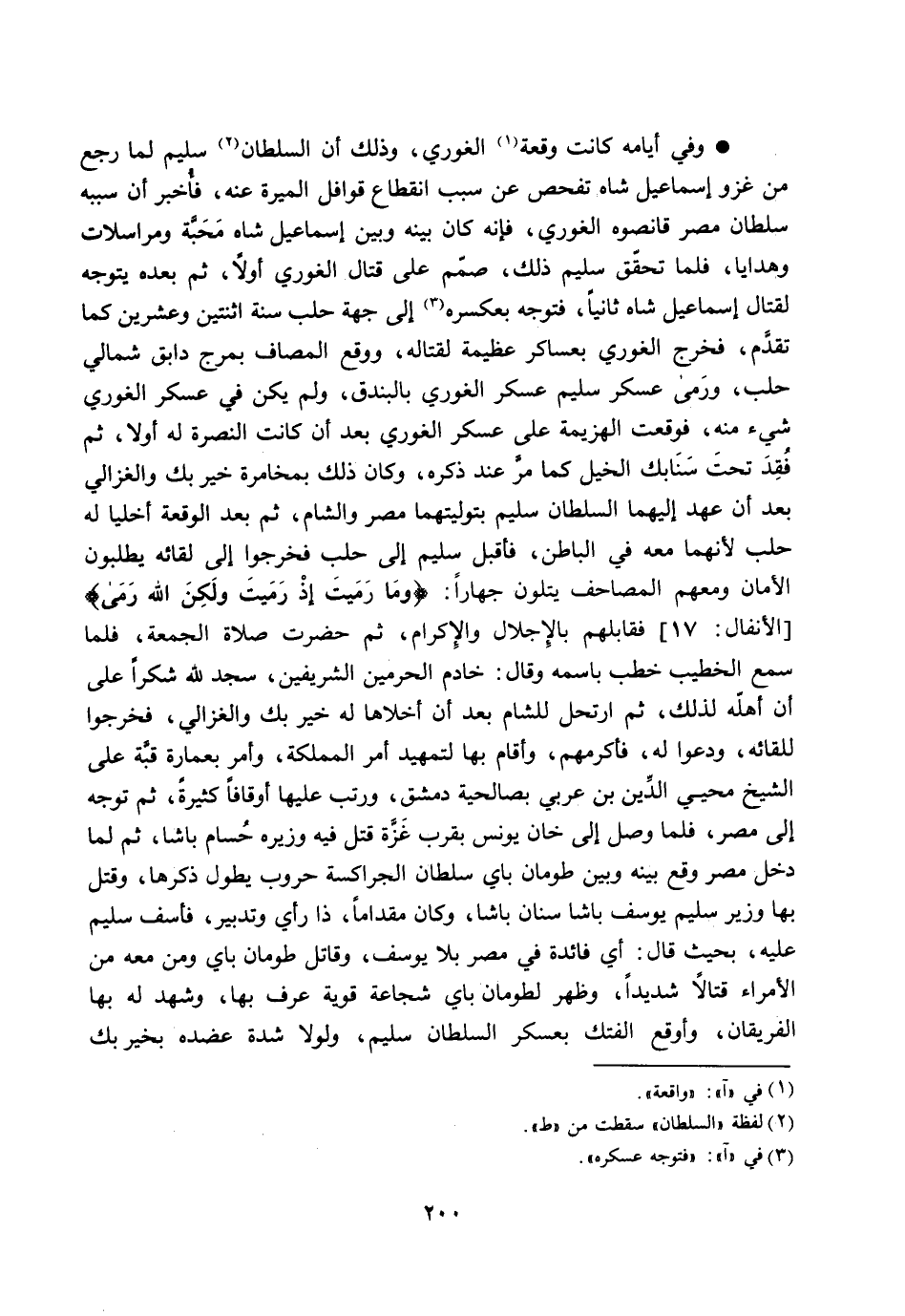 وفي أيامه كانت وقعة [1] الغوري، وذلك أن السلطان [2] سليم لما رجع من غزو إسماعيل شاه تفحص عن سبب انقطاع قوافل الميرة عنه، فأخبر أن سببه سلطان مصر قانصوه الغوري، فإنه كان بينه وبين إسماعيل شاه محبّة ومراسلات وهدايا، فلما تحقّق سليم ذلك، صمّم على قتال الغوري، أولا، ثم بعده يتوجه لقتال إسماعيل شاه ثانيا، فتوجه بعكسره [3] إلى جهة حلب سنة اثنتين وعشرين كما تقدّم، فخرج الغوري بعساكر عظيمة لقتاله، ووقع المصاف بمرج دابق شمالي حلب، ورمى عسكر سليم عسكر الغوري بالبندق، ولم يكن في عسكر الغوري شيء منه، فوقعت الهزيمة على عسكر الغوري بعد أن كانت النصرة له أولا، ثم فقد تحت سنابك الخيل كما مرّ عند ذكره، وكان ذلك بمخامرة خير بك والغزالي بعد أن عهد إليهما السلطان سليم بتوليتهما مصر والشام، ثم بعد الوقعة أخليا له حلب لأنهما معه في الباطن، فأقبل سليم إلى حلب فخرجوا إلى لقائه يطلبون الأمان ومعهم المصاحف يتلون جهارا: وَما رَمَيْتَ إِذْ رَمَيْتَ وَلكِنَّ الله رَمى 8: 17 [الأنفال: 17] فقابلهم بالإجلال والإكرام، ثم حضرت صلاة الجمعة، فلما سمع الخطيب خطب باسمه وقال: خادم الحرمين الشريفين، سجد لله شكرا على أن أهلّه لذلك، ثم ارتحل للشام بعد أن أخلاها له خير بك والغزالي، فخرجوا للقائه، ودعوا له، فأكرمهم، وأقام بها لتمهيد أمر المملكة، وأمر بعمارة قبّة على الشيخ محيي الدّين بن عربي بصالحية دمشق، ورتب عليها أوقافا كثيرة، ثم توجه إلى مصر، فلما وصل إلى خان يونس بقرب غزّة قتل فيه وزيره حسام باشا، ثم لما دخل مصر وقع بينه وبين طومان باي سلطان الجراكسة حروب يطول ذكرها، وقتل بها وزير سليم يوسف باشا سنان باشا، وكان مقداما، ذا رأي وتدبير، فأسف سليم عليه، بحيث قال: أي فائدة في مصر بلا يوسف، وقاتل طومان باي ومن معه من الأمراء قتالا شديدا، وظهر لطومان باي شجاعة قوية عرف بها، وشهد له بها الفريقان، وأوقع الفتك بعسكر السلطان سليم، ولولا شدة عضده بخير بك