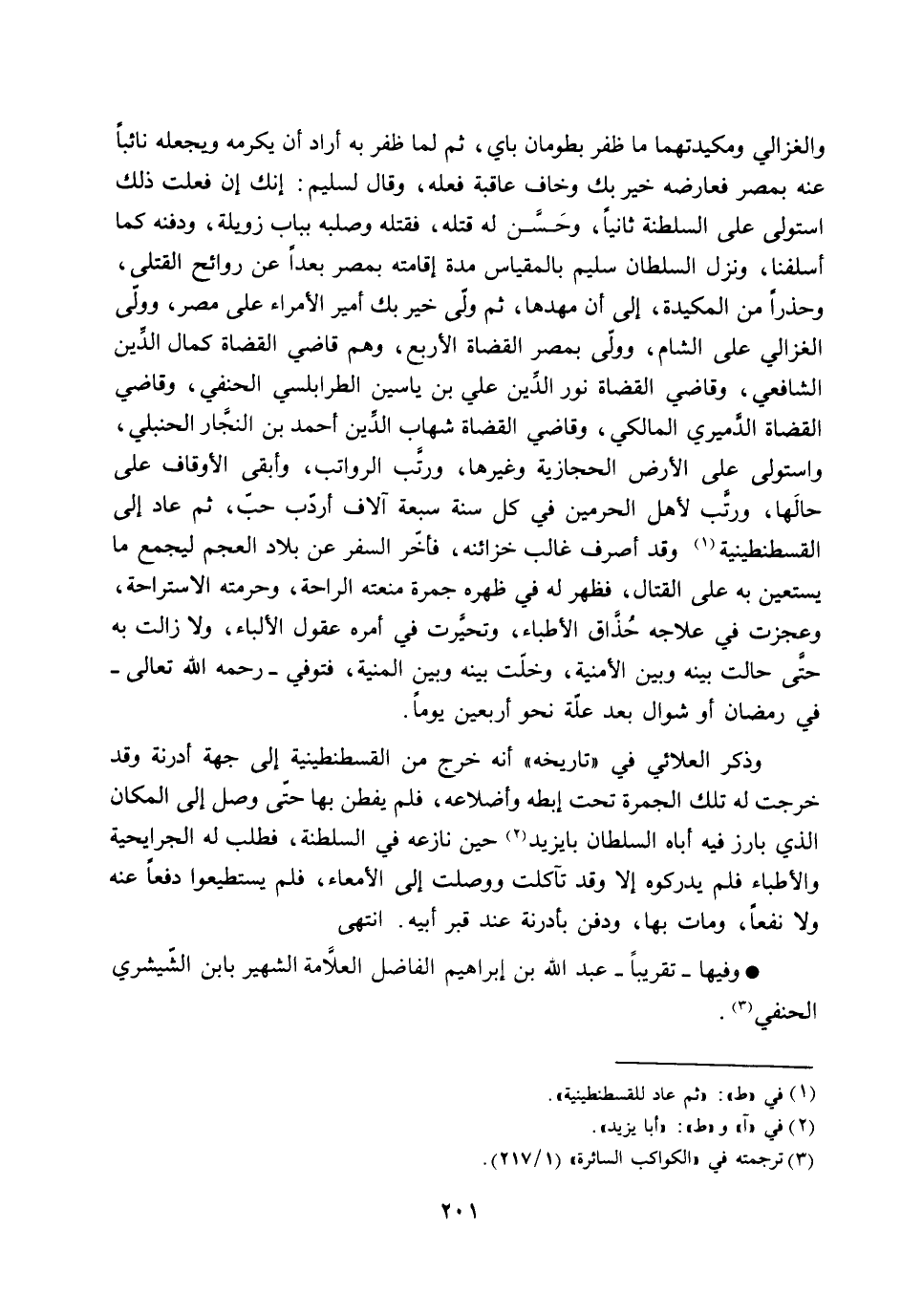 وذكر العلائي في «تاريخه» أنه خرج من القسطنطينية إلى جهة أدرنة وقد خرجت له تلك الجمرة تحت إبطه وأضلاعه، فلم يفطن بها حتّى وصل إلى المكان الذي بارز فيه أباه السلطان بايزيد [2] حين نازعه في السلطنة، فطلب له الجرايحية والأطباء فلم يدركوه إلا وقد تآكلت ووصلت إلى الأمعاء، فلم يستطيعوا دفعا عنه ولا نفعا، ومات بها، ودفن بأدرنة عند قبر أبيه. انتهى وفيها- تقريبا- عبد الله بن إبراهيم الفاضل العلّامة الشهير بابن الشّيشري الحنفي [3] .