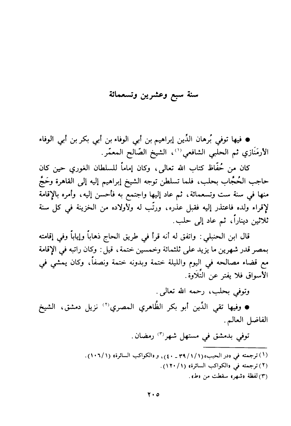 فيها توفي برهان الدّين إبراهيم بن أبي الوفاء بن أبي بكر بن أبي الوفاء الأرمنازي ثم الحلبي الشافعي [1] ، الشيخ الصّالح المعمّر.