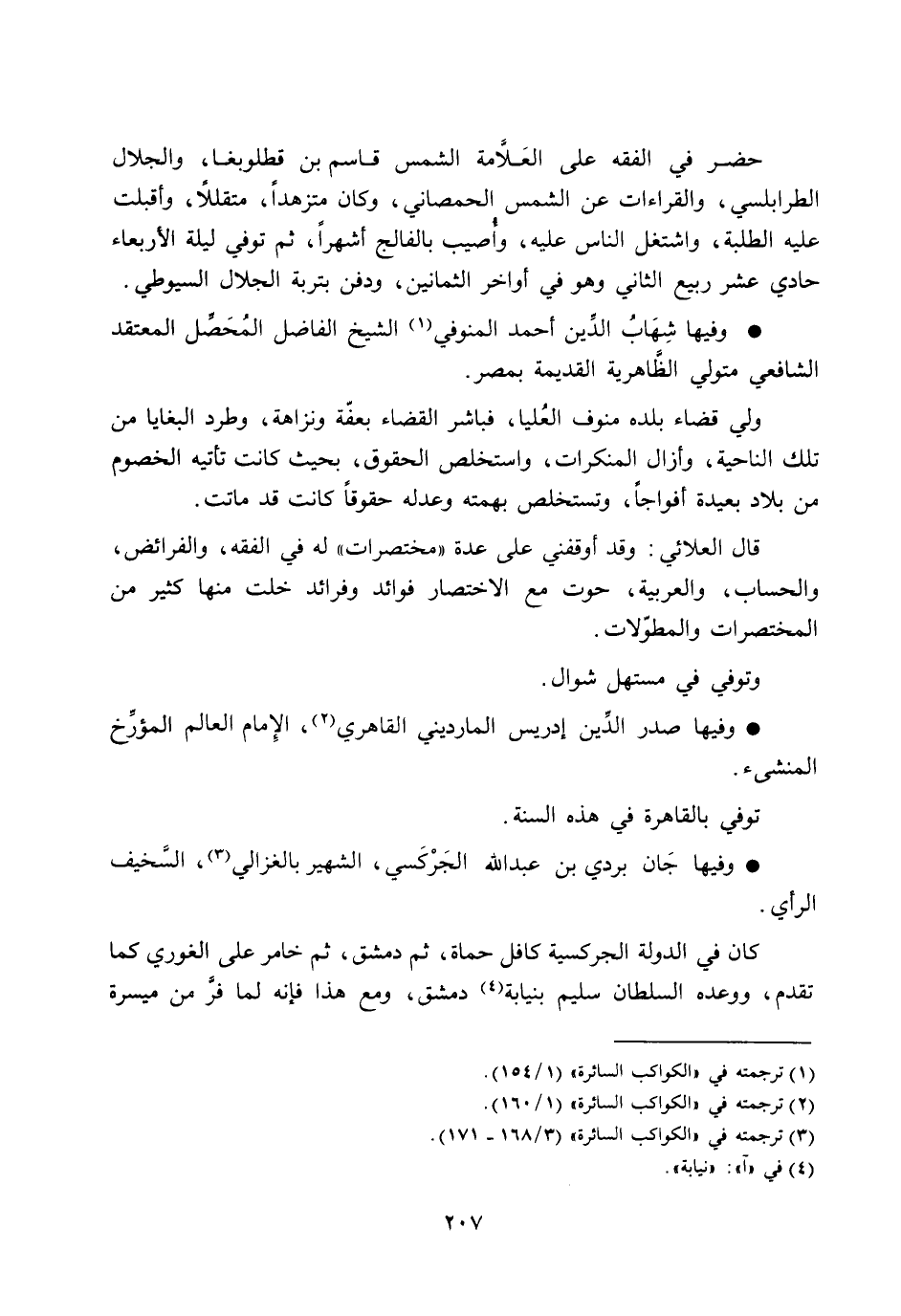 وفيها شهاب الدّين أحمد المنوفي [1] الشيخ الفاضل المحصّل المعتقد الشافعي متولي الظّاهرية القديمة بمصر.