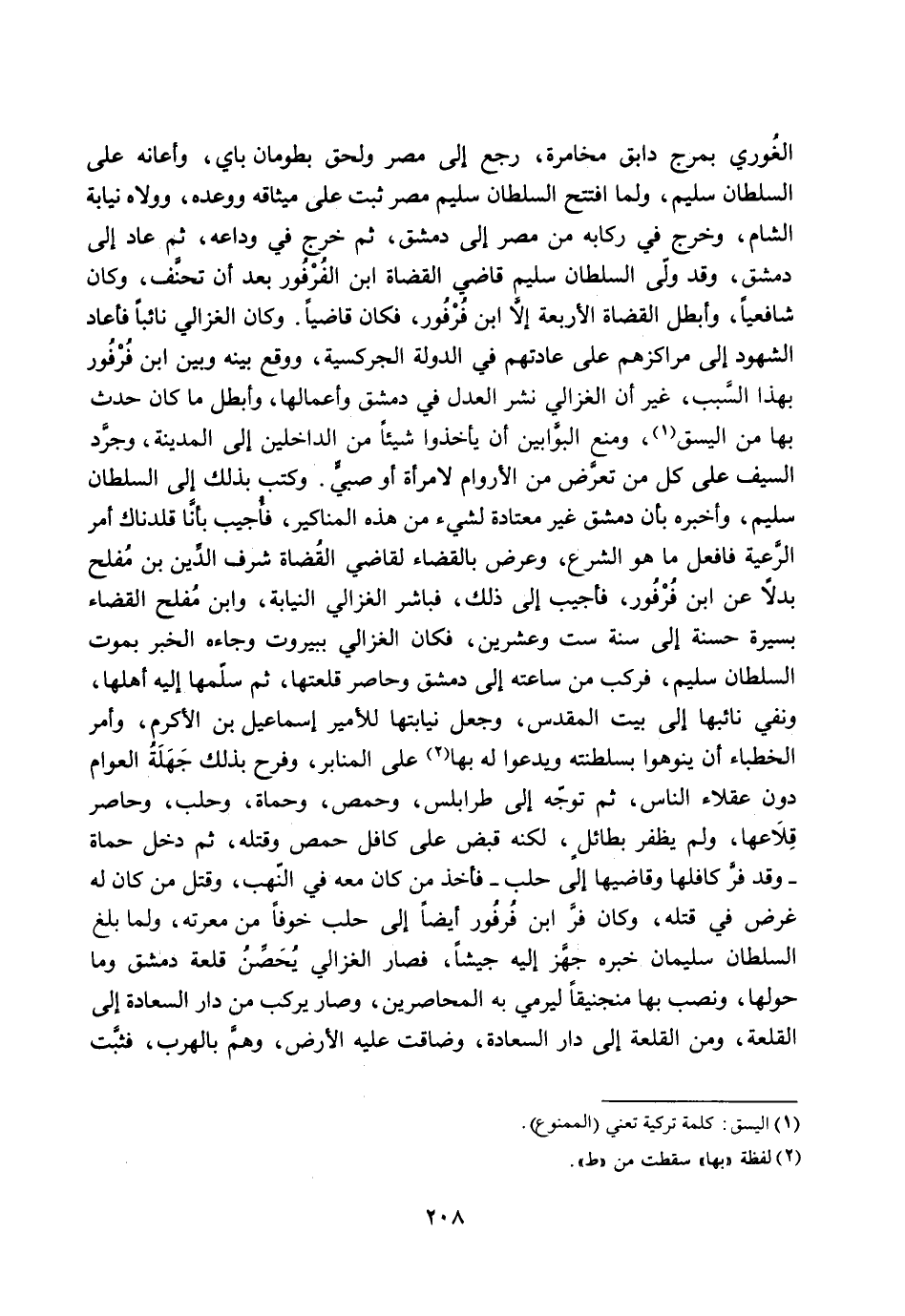 الغوري بمرج دابق مخامرة، رجع إلى مصر ولحق بطومان باي، وأعانه على السلطان سليم، ولما افتتح السلطان سليم مصر ثبت على ميثاقه ووعده، وولاه نيابة الشام، وخرج في ركابه من مصر إلى دمشق، ثم خرج في وداعه، ثم عاد إلى دمشق، وقد ولّى السلطان سليم قاضي القضاة ابن الفرفور بعد أن تحنّف، وكان شافعيا، وأبطل القضاة الأربعة إلّا ابن فرفور، فكان قاضيا. وكان الغزالي نائبا فأعاد الشهود إلى مراكزهم على عادتهم في الدولة الجركسية، ووقع بينه وبين ابن فرفور بهذا السّبب، غير أن الغزالي نشر العدل في دمشق وأعمالها، وأبطل ما كان حدث بها من اليسق [1] ، ومنع البوّابين أن يأخذوا شيئا من الداخلين إلى المدينة، وجرّد السيف على كل من تعرّض من الأروام لامرأة أو صبيّ. وكتب بذلك إلى السلطان سليم، وأخبره بأن دمشق غير معتادة لشيء من هذه المناكير، فأجيب بأنّا قلدناك أمر الرّعية فافعل ما هو الشرع، وعرض بالقضاء لقاضي القضاة شرف الدّين بن مفلح بدلا عن ابن فرفور، فأجيب إلى ذلك، فباشر الغزالي النيابة، وابن مفلح القضاء بسيرة حسنة إلى سنة ست وعشرين، فكان الغزالي ببيروت وجاءه الخبر بموت السلطان سليم، فركب من ساعته إلى دمشق وحاصر قلعتها، ثم سلّمها إليه أهلها، ونفي نائبها إلى بيت المقدس، وجعل نيابتها للأمير إسماعيل بن الأكرم، وأمر الخطباء أن ينوهوا بسلطنته ويدعوا له بها [2] على المنابر، وفرح بذلك جهلة العوام دون عقلاء الناس، ثم توجّه إلى طرابلس، وحمص، وحماة، وحلب، وحاصر قلاعها، ولم يظفر بطائل، لكنه قبض على كافل حمص وقتله، ثم دخل حماة- وقد فرّ كافلها وقاضيها إلى حلب- فأخذ من كان معه في النّهب، وقتل من كان له غرض في قتله، وكان فرّ ابن فرفور أيضا إلى حلب خوفا من معرته، ولما بلغ السلطان سليمان خبره جهّز إليه جيشا، فصار الغزالي يحصّن قلعة دمشق وما حولها، ونصب بها منجنيقا ليرمي به المحاصرين، وصار يركب من دار السعادة إلى القلعة، ومن القلعة إلى دار السعادة، وضاقت عليه الأرض، وهمّ بالهرب، فثبّت