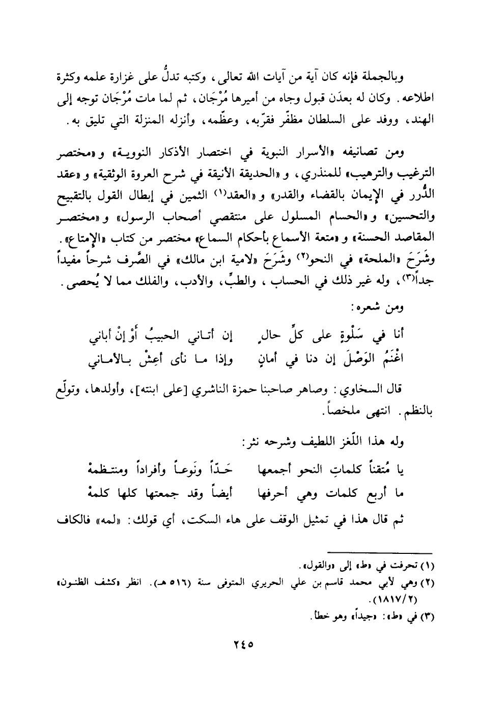 وشرح «المحلة» في النحو [2] وشرح «لامية ابن مالك» في الصّرف شرحا مفيدا جدا [3] ، وله غير ذلك في الحساب، والطبّ، والأدب، والفلك مما لا يحصى.