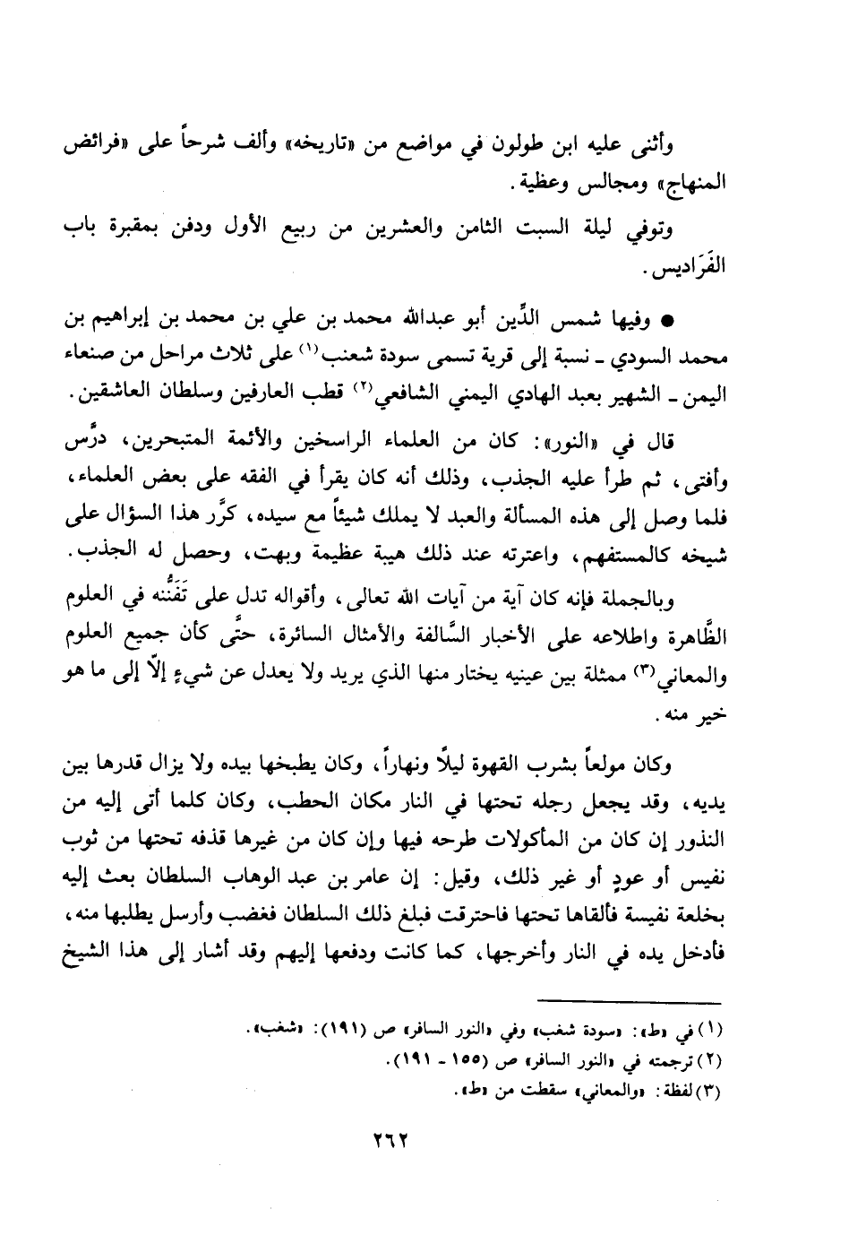وفيها شمس الدّين أبو عبد الله محمد بن علي بن محمد بن إبراهيم بن محمد السودي- نسبة إلى قرية تسمى سودة شعنب [1] على ثلاث مراحل من صنعاء اليمن- الشهير بعبد الهادي اليمني الشافعي [2] قطب العارفين وسلطان العاشقين.