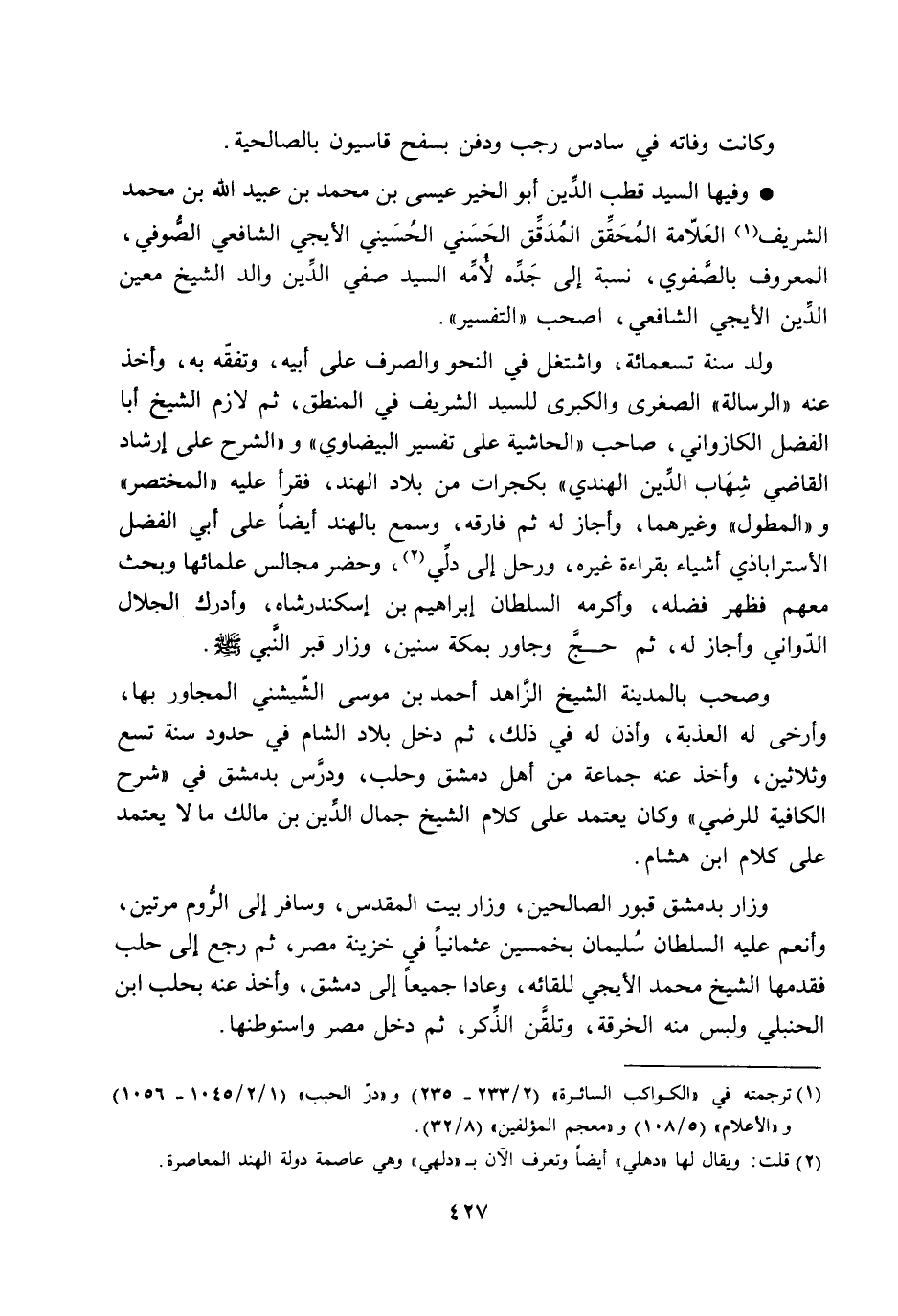 وفيها السيد قطب الدّين أبو الخير عيسى بن محمد بن عبيد الله بن محمد الشريف [1] العلّامة المحقّق المدقّق الحسني الحسيني الأيجي الشافعي الصّوفي، المعروف بالصّفوي، نسبة إلى جدّه لأمّه السيد صفي الدّين والد الشيخ معين الدّين الأيجي الشافعي، اصحب «التفسير» .