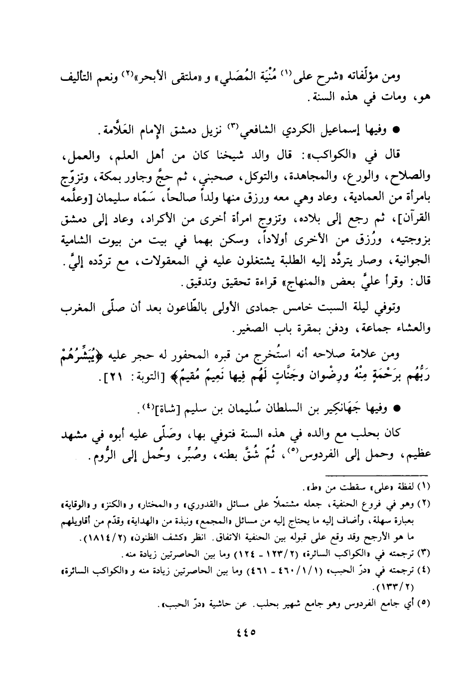 ومن مؤلّفاته «شرح على [1] منية المصلي» و «ملتقى الأبحر» [2] ونعم التأليف هو، ومات في هذه السنة.
