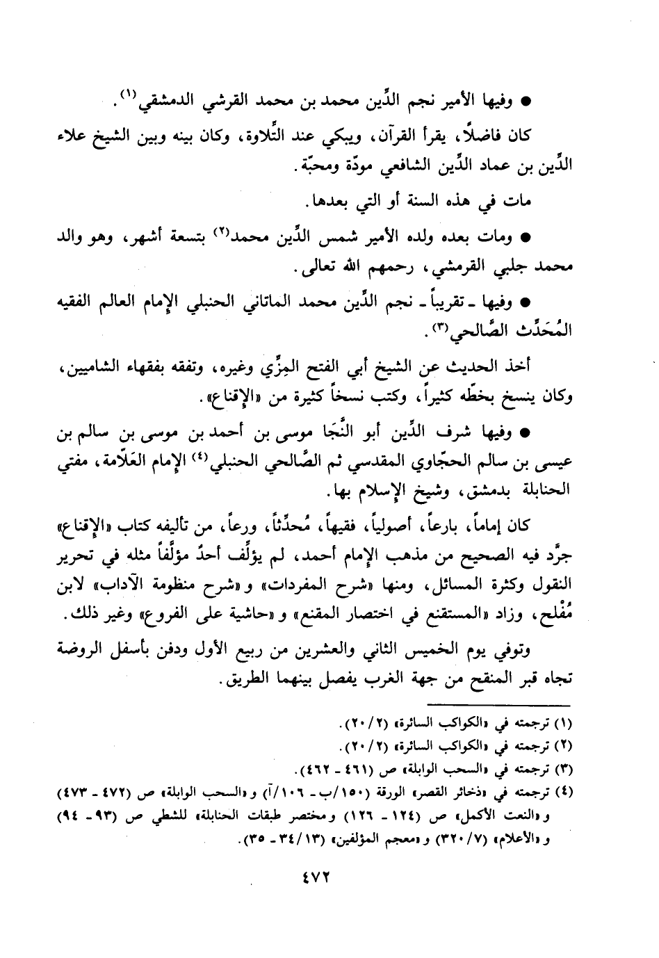 [4] ترجمته في «ذخائر القصر» الورقة (150/ ب- 106/ آ) و «السحب الوابلة» ص (472- 473) و «النعت الأكمل» ص (124- 126) ومختصر طبقات الحنابلة» للشطي ص (93- 94) و «الأعلام» (7/ 320) و «معجم المؤلفين» (13/ 34- 35) .
