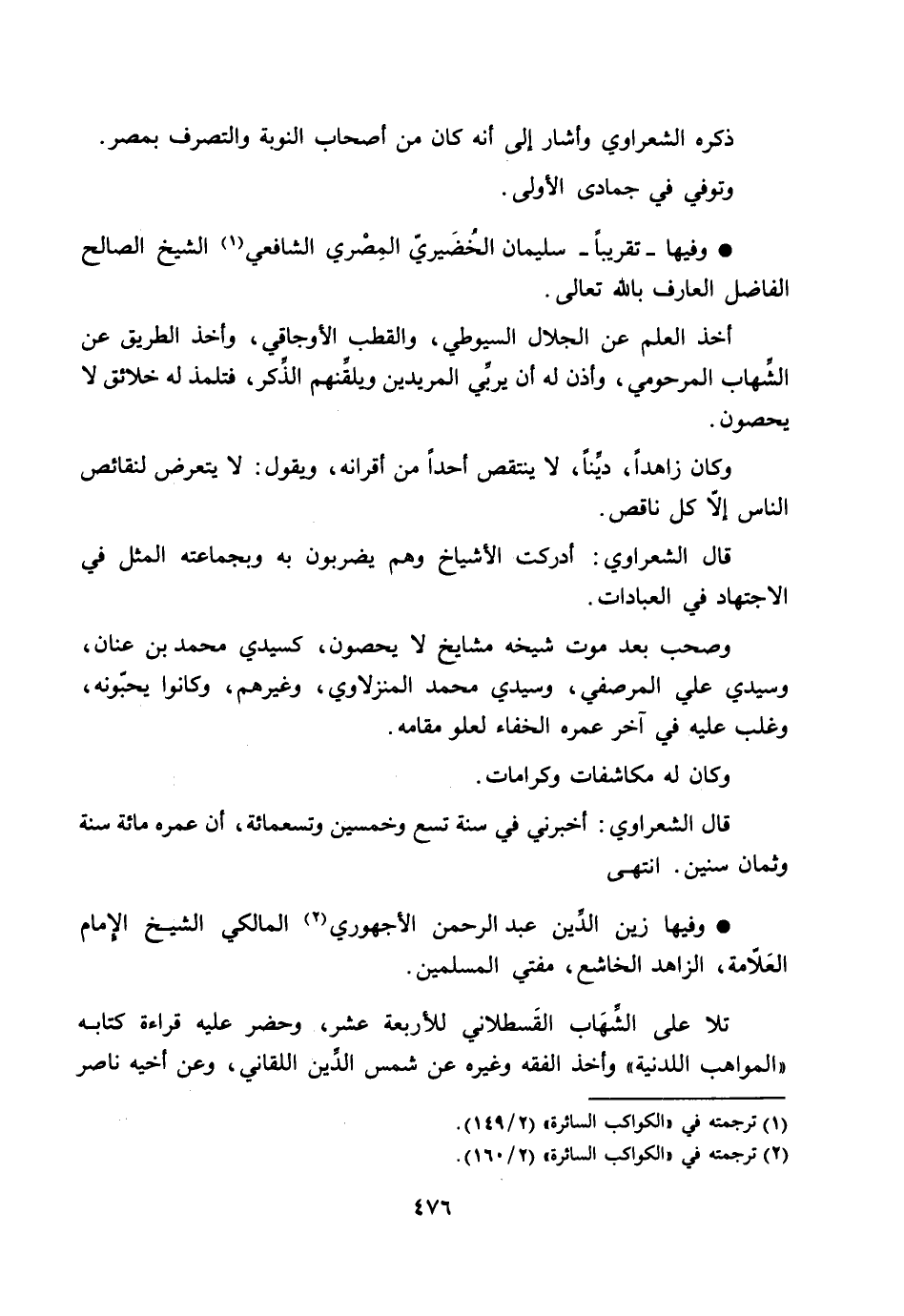 قال الشعراوي: أخبرني في سنة تسع وخمسين وتسعمائة، أن عمره مائة سنة وثمان سنين. انتهى وفيها زين الدّين عبد الرحمن الأجهوري [2] المالكي الشيخ الإمام العلّامة، الزاهد الخاشع، مفتي المسلمين.