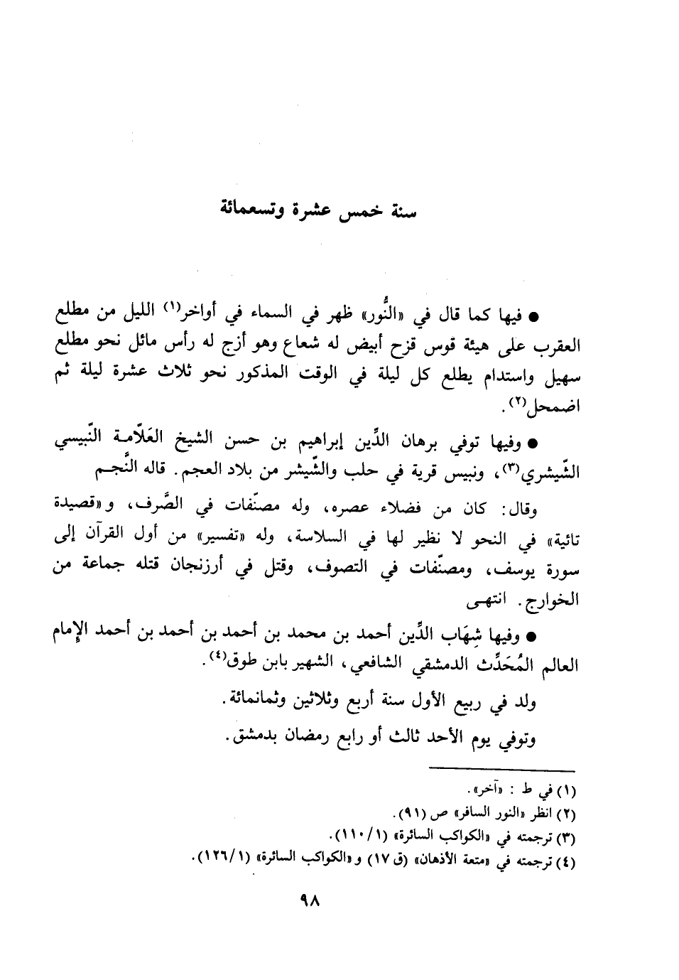 وفيها توفي برهان الدّين إبراهيم بن حسن الشيخ العلّامة النّبيسي الشّيشري [3] ، ونبيس قرية في حلب والشّيشر من بلاد العجم. قاله النّجم وقال: كان من فضلاء عصره، وله مصنّفات في الصّرف، و «قصيدة تائية» في النحو لا نظير لها في السلاسة، وله «تفسير» من أول القرآن إلى سورة يوسف، ومصنّفات في التصوف، وقتل في أرزنجان قتله جماعة من الخوارج. انتهى وفيها شهاب الدّين أحمد بن محمد بن أحمد بن أحمد بن أحمد الإمام العالم المحدّث الدمشقي الشافعي، الشهير بابن طوق [4] .