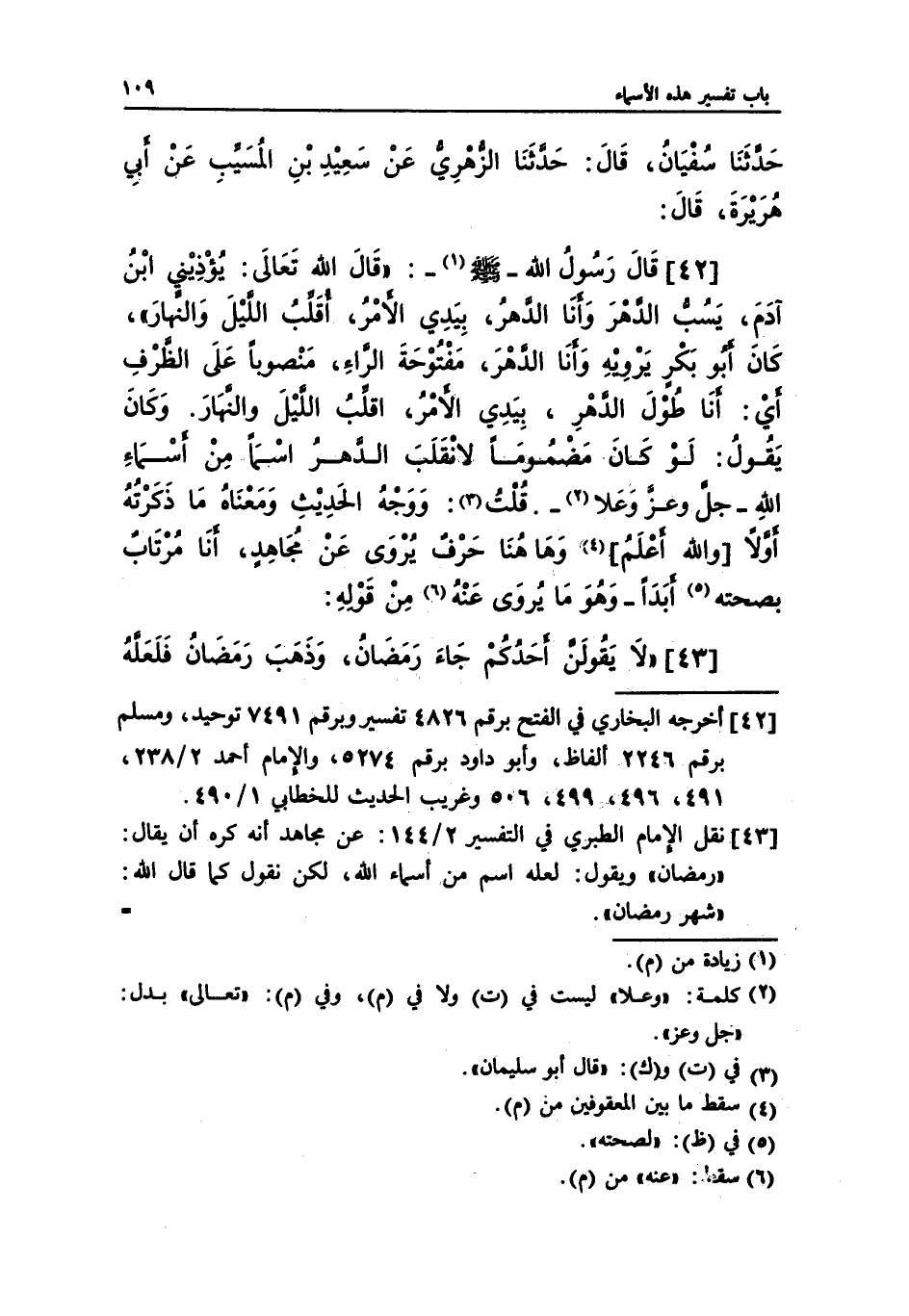 [42] أخرجه البخاري في الفتح برقم 4826 تفسير وبرقم 7491 توحيد، ومسلم برقم 2246 ألفاظ، وأبو داود برقم 5274، والإمام أحمد 2/ 238، 491، 496، 499، 506 وغريب الحديث للخطابي 1/ 490.