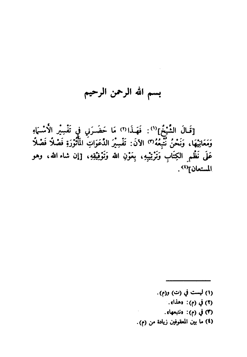 [قَالَ الشيخ] (¬1): فَهَذَا (¬2) مَا حَضَرَنِي في تَفْسير الأسماء وَمَعَانِيهَا، وَنَحْنُ نُتْبِعُهُ (¬3) الآنَ: تَفْسِيرَ الدَّعَوَاتِ المأثوْرَةِ فَصْلاً فَصْلاً عَلى نَظْمِ الكِتَابِ وَتَرْتِيْبِهِ، بِعَوْنِ الله وَتَوْفيْقِهِ، [إن شاء الله، وهو المستعان] (¬4).