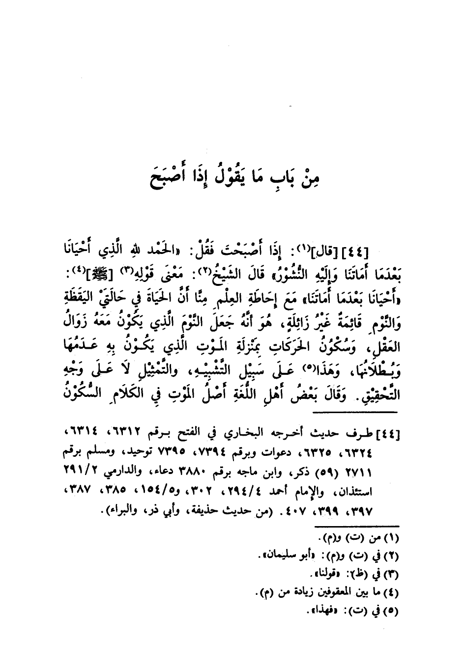 [44] [قال] (¬1): إذَا أصْبَحْتَ فَقُلْ: "الحَمْد لله الذِي أحْيَانَا بَعْدَمَا أمَاتَنَا وَإلَيْهِ النُّشُوْرُ" قَالَ الشيْخُ (¬2): مَعْنَى قَوْلهِ (¬3) [- صلى الله عليه وسلم -] (¬4): "أحْيَانَا بَعْدَمَا أمَاتَنَا" مَعَ إحَاطَةِ العِلْمِ مِنا أن الحَيَاةَ في حَالَتَيْ اليَقَظَةِ وَالنوْمِ قَائمةٌ غيرُ زَائلةٍ، هُوَ أنهُ جَعَلَ النوْمَ الذِي يَكوْن مَعَهُ زَوَالُ العَقلِ، وَسُكْوُنُ الحَرَكَاتِ بِمَنْزلَةِ المَوْتِ الذِي يَكُوْنُ بِهِ عَدَمُهَا وَبُطلَانُهَا، وَهَذَا (¬5) عَلَى سَبِيْل التشْبِيْهِ، والتمْثِيْلِ لَا عَلَى وَجْهِ التحقيقِ. وَقَالَ بَعْضُ أهْلِ اللغة أصْلُ المَوْتِ فِي الكَلَامِ السُّكُوْنُ