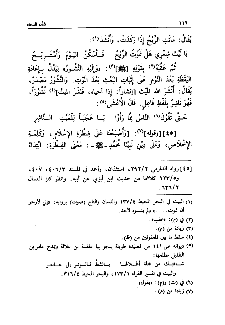 ثُمَ عَقبَهُ (¬2) بِقَوْلهِ [- صلى الله عليه وسلم -] (¬3): "وَإلَيْهِ النشُورُ" لِيَدُلَّ بِإعَادَةِ اليَقَظَةِ بَعْدَ النوْمِ عَلى إثْبَاتِ البَعْثِ بَعْدَ المَوْتِ. وَالنشُوْرُ مَصْدَرٌ، يُقَالُ: أنشَرَ الله المَيْتَ [إنشاراً: إذا أحياه، فَنَشَرَ الميتُ] (¬4) نُشُوْرَا، فَهُوَ نَاشِرٌ بِلَفْظِ فَاعِلٍ. قَالَ الأعْشَى (¬5):
