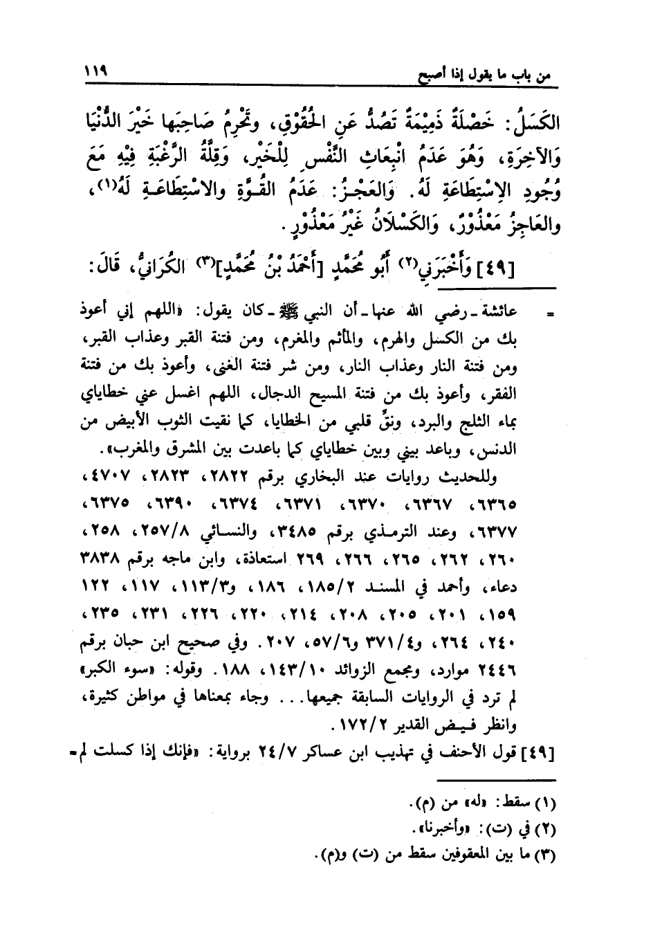 وللحديث روايات عند البخاري برقم 2822، 2823، 4707، 6365، 6367، 6370، 6371، 6374، 6390، 6375، 6377، وعند الترمذي برقم 3485، والنسائي 8/ 257، 258، 260، 262، 265، 266، 269 استعاذة، وابن ماجه برقم 3838 دعاء، وأحمد في المسند 2/ 185، 186، و3/ 113، 117، 122 159، 201، 205، 208، 214، 220، 226، 231، 235، 240، 264، و 4/ 371 و6/ 57، 207. وفي صحيح ابن حبان برقم 2446 موارد، ومجمع الزوائد 10/ 143، 188. وقوله: "سوء الكبر" لم ترد في الروايات السابقة جميعها ... وجاء بمعناها في مواطن كثيرة، وانظر فيض القدير 2/ 172.