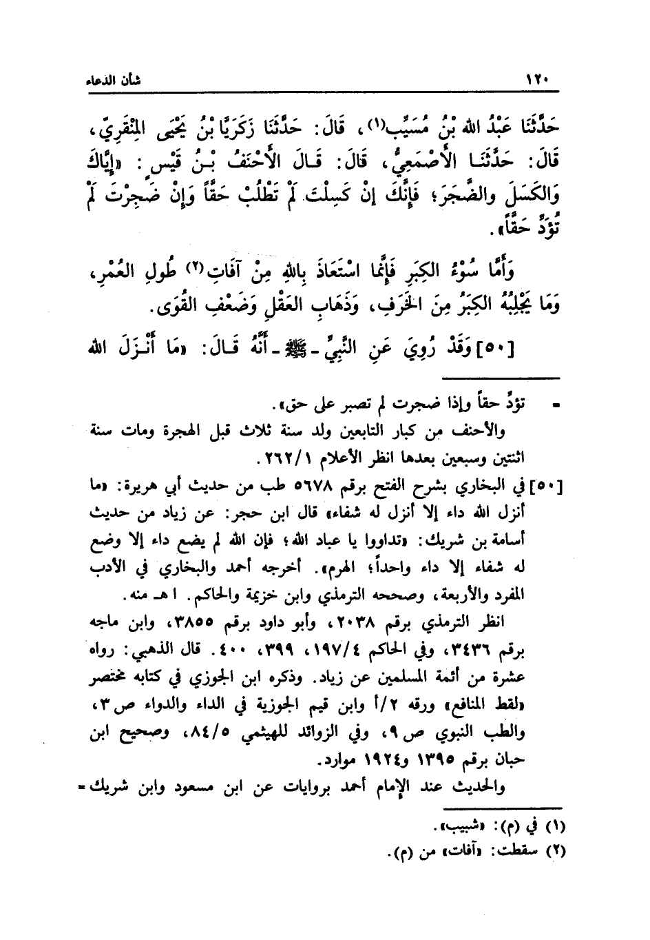 [50] في البخاري بشرح الفتح برقم 5678 طب من حديث أبي هريرة: "ما أنزل الله داء إِلا أنزل له شفاء" قال ابن حجر: عن زياد من حديث أسامة بن شريك: "تداووا يا عباد الله؛ فإن الله لم يضع داء إِلا وضع له شفاء إِلا داء واحداً؛ الهرم". أخرجه أحمد والبخاري في الأدب المفرد والأربعة، وصححه الترمذي وابن خزيمة والحاكم. اهـ منه.