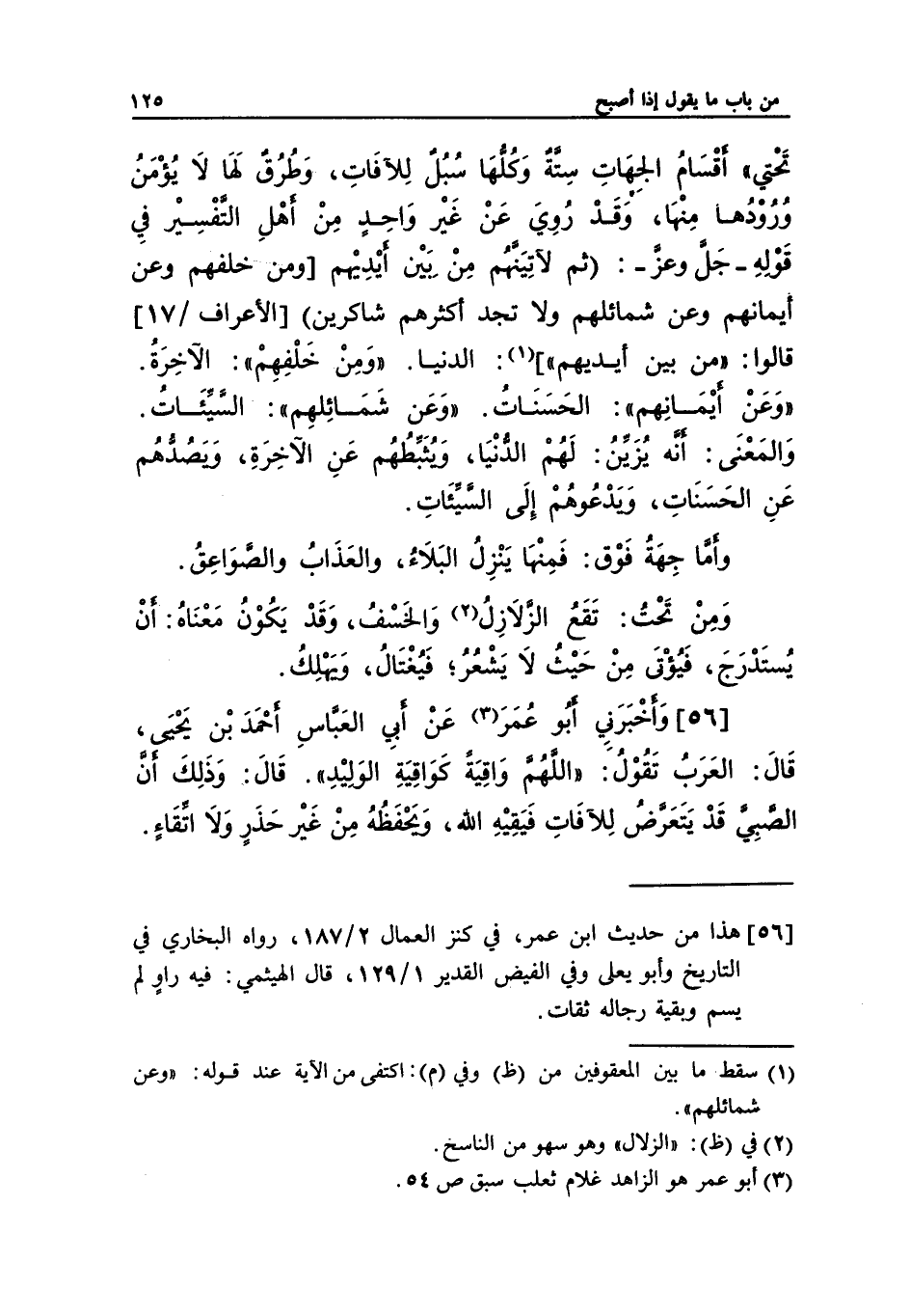 [56] هذا من حديث ابن عمر، في كنز العمال 2/ 187، رواه البخاري في التاريخ وأبو يعلى وفي الفيض القدير 1/ 129، قال الهيثمي: فيه راوٍ لم يسم وبقية رجاله ثقات.