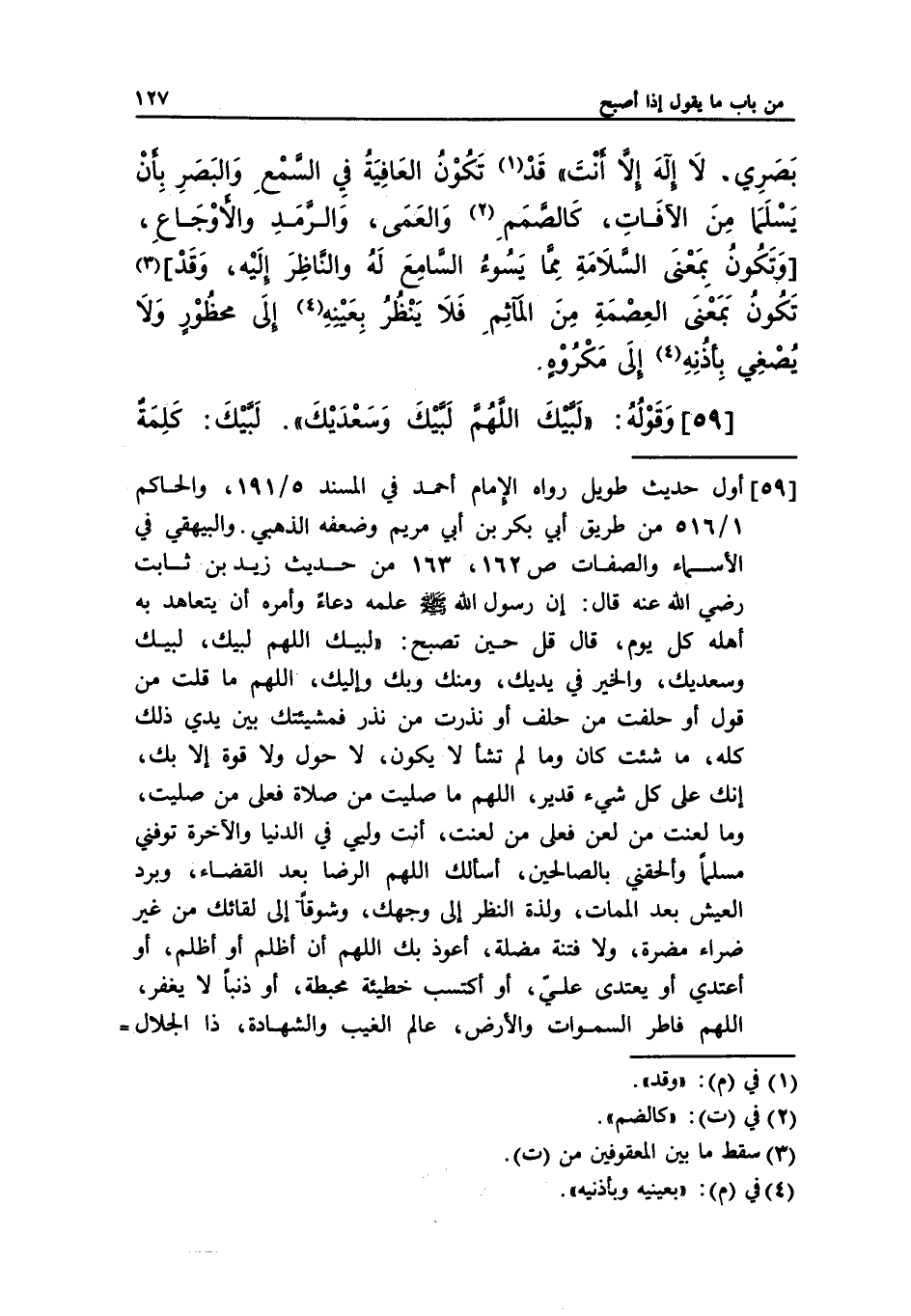 [59] أول حديث طويل رواه الإمام أحمد في المسند 5/ 191، والحاكم 1/ 516 من طريق أبي بكر بن أبي مريم وضعفه الذهبي. والبيهقي في الأسماء والصفات ص 162، 163 من حديث زيد بن ثابت رضي الله عنه قال: إن رسول الله - صلى الله عليه وسلم - علمه دعاءً وأمره أن يتعاهد به أهله كل يوم، قال قل حين تصبح: "لبيك اللهم لبيك، لبيك وسعديك، والخير في يديك، ومنك وبك وإليك، اللهم ما قلت من قول أو حلفت من حلف أو نذرت من نذر فمشيئتك بين يدي ذلك كله، ما شئت كان وما لم تشأ لا يكون، لا حول ولا قوة إِلا بك، إِنك على كل شيء قدير، اللهم ما صليت من صلاة فعلى من صليت، وما لعنت من لعن فعلى من لعنت، أنت وليي في الدنيا والآخرة توفني مسلماً وألحقني بالصالحين، أسألك اللهم الرضا بعد القضاء، وبرد العيش بعد الممات، ولذة النظر إِلى وجهك، وشوقاً إلى لقائك من غير ضراء مضرة، ولا فتنة مضلة، أعوذ بك اللهم أن أظلم أو أظلم، أو أعتدي أو يعتدى عليّ، أو أكتسب خطيئة محبطة، أو ذنباً لا يغفر، اللهم فاطر السموات والأرض، عالم الغيب والشهادة، ذا الجلال=