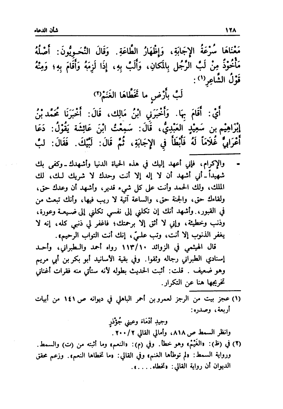 أيْ: أقَامَ بِهَا. وَأخْبَرَنِي ابْنُ مَالِك، قَالَ: أخْبَرَنَا محمد بنُ إبراهِيْم بن سَعِيْدٍ العَبْدِيُّ، قَالَ: سَمِعْتُ ابْنَ عَائِشَة يَقُوْلُ: دَعَا أعرَابيٌّ غُلَامَاً لَهُ فَأبْطَأ فِي الإجَابَةِ، ثُم قَالَ: لَبَّيْكَ. فَقَالَ: لبَّ