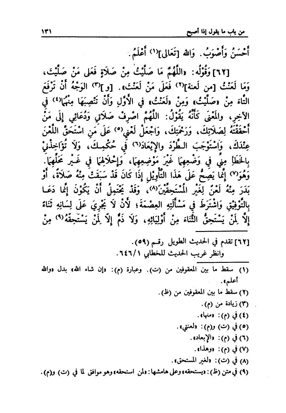 [62] وَقُوْلُه: "اللهم مَا صَلَّيْتُ مِنْ صَلَاةٍ فَعَلى مَنْ صَلَّيْتَ، وَمَا لَعَنْتُ [من لَعنة] (¬2) فَعَلَى مَنْ لَعَنْتَ". [و] (¬3) الوَجْهُ أنْ تَرْفَعَ التاءَ مِنْ "صَلَّيْتُ" وَمِنْ "لَعَنْتُ " في الأولِ وَأنْ تَنْصِبَهَا مِنْهُما (¬4) فِي الآخِرِ، والمَعْنَى كَأنهُ يَقُوْلُ: اللهم اصْرِفْ صَلاَتِي وَدُعَائِي إلَى مَنْ أحْقَقْتَهُ لِصَلَاتِكَ، وَرَحْمَتِكَ، وَاجْعَلْ لَعْنِي (¬5) عَلَى مَنِ اسْتَحَقَّ اللَّعْنَ عِنْدَكَ، واسْتَوْجَبَ الطَّرْدَ والإيْعَادَ (¬6) فِي حُكْمِكَ، وَلَا تُؤَاخِذْنيْ بِالخَطَأِ مِني فِي وَضْعِهِمَا غَيْرَ مَوْضِعِهِمَا، وَإحْلَالِهمَا فِي غير مَحَلِّهِمَا.