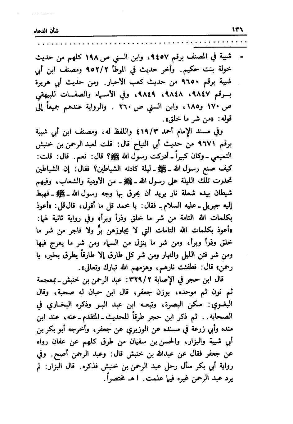وفي مسند الإمام أحمد 3/ 419 واللفظ له، ومصنف ابن أبي شيبة برقم 9671 من حديث أي التياح قال: قلت لعبد الرحمن بن خنبش التميمي -وكان كبيراً- أدركت رسول الله - صلى الله عليه وسلم -؟ قال: نعم. قال: قلت: كيف صنع رسول الله - صلى الله عليه وسلم - ليلة كادته الشياطين؟ فقال: إن الشياطين تحدرت تلك الليلة على رسول الله - صلى الله عليه وسلم - من الأودية والشعاب، وفيهم شيطان بيده شعلة نار يريد أن يحرق بها وجه رسول الله - صلى الله عليه وسلم - فهبط إليه جبريل -عليه السلام- فقال: يا محمد قل ما أقول، قال قل: "أعوذ بكلمات الله التامة من شر ما خلق وذرأ وبرأ" وفي رواية ثانية لهما: "أعوذ بكلمات الله التامات التي لا يجاوزهن برٌّ ولا فاجر من شر ما خلق وذرأ وبرأ، ومن شر ما ينزل من السماء ومن شر ما يعرج فيها ومن شر فتن الليل والنهار ومن شر كل طارق إلا طارقاً يطرق بخير، يا رحمن" قال: فطفئت نارهم، وهزمهم الله تبارك وتعالى".
