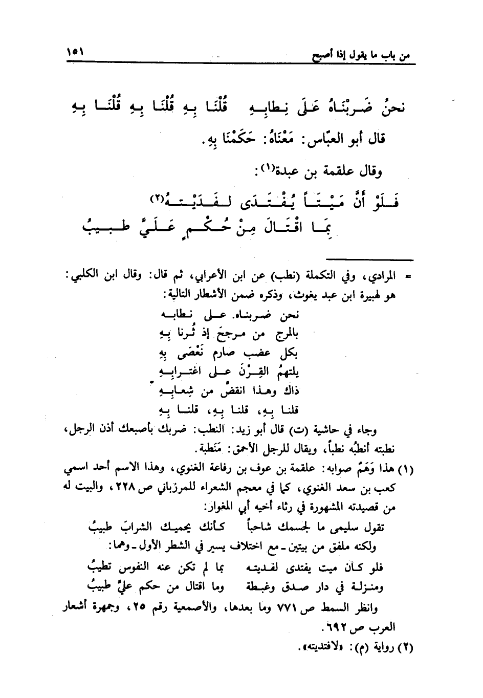 = المرادي، وفي التكملة (نطب) عن ابن الأعرابي، ثم قال: وقال ابن الكلبي: هو لهبيرة ابن عبد يغوث، وذكره ضمن الأشطار التالية: