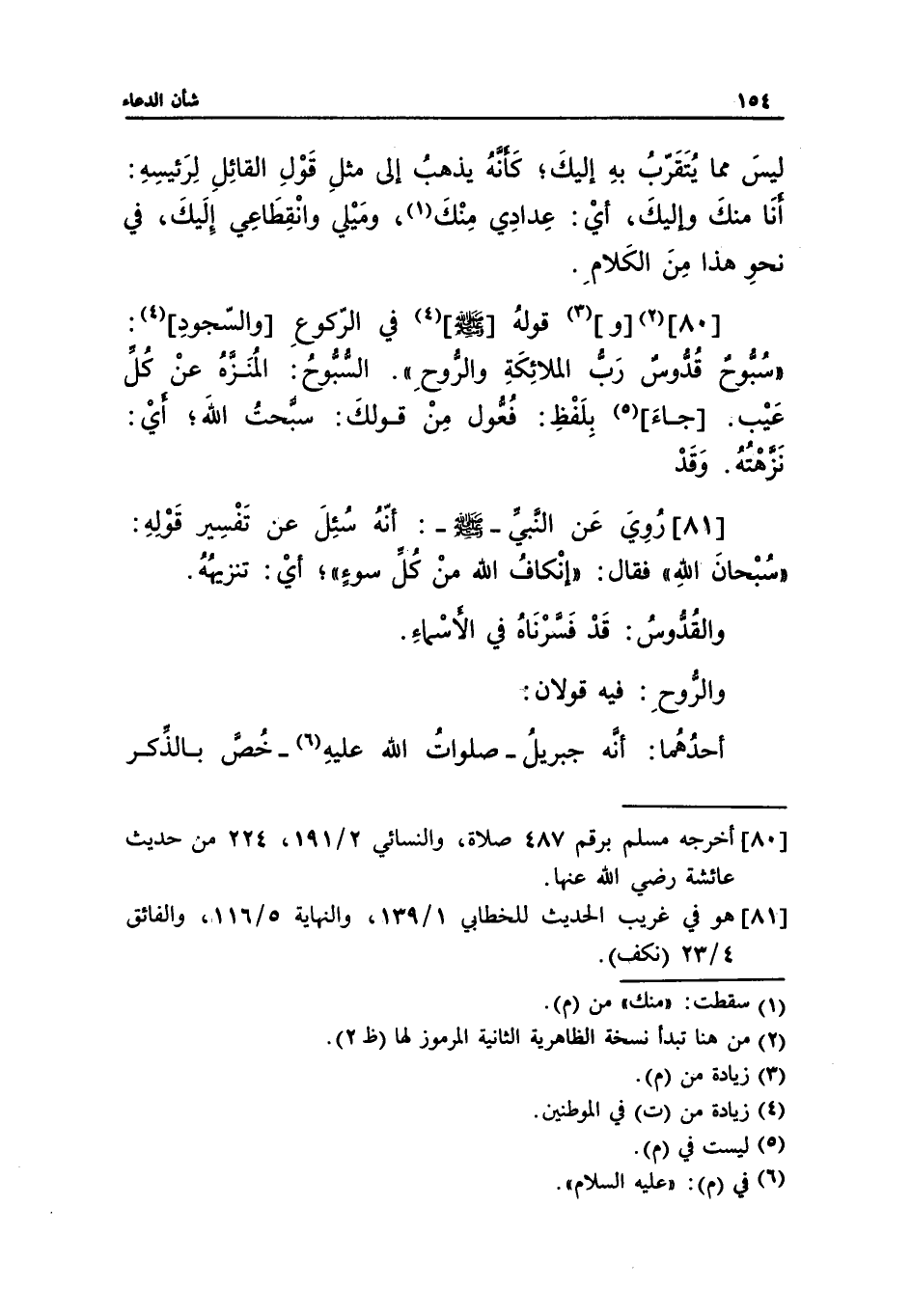[80] (¬2) [و] (¬3) قولهُ [- صلى الله عليه وسلم -] (¬4) في الركوع [والسجودِ] (4): "سُبُّوحٌ قُدُّوسٌ رَب الملائِكَةِ والرُّوحِ". السُّبُّوحُ: المُنَزهُ عنْ كُل عَيْب. [جاءَ] (¬5) بِلَفْظِ: فُعُّول مِنْ قولكَ: سبَّحتُ اللهَ؛ أيْ: نَزهْتُهُ. وَقَدْ