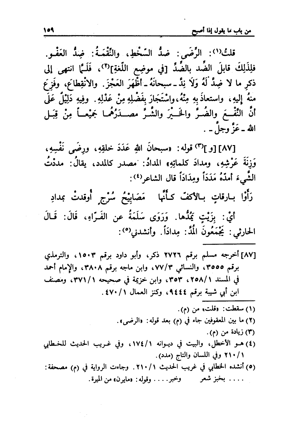 [87] [و] (¬3) قوله: "سبحانَ اللهِ عَدَدَ خلقِهِ، ورِضَى نَفْسِهِ، وَزِنَةَ عَرْشِهِ، ومدادَ كلماتِهِ" المداد: مصدر كالمدد، يقالُ: مددْتُ الشيءَ أمدّهُ مَدَدَاً ومِدَادَاً قال الشاعر (¬4):