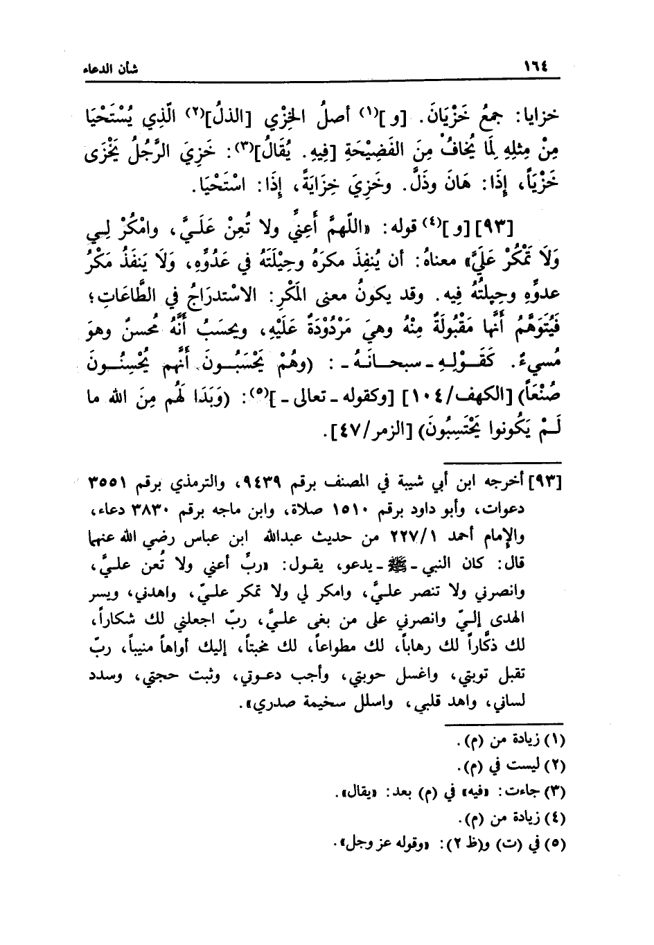 [93] أخرجه ابن أبي شيبة في المصنف برقم 9439، والترمذي برقم 3551 دعوات، وأبو داود برقم 1510 صلاة، وابن ماجه برقم 3830 دعاء، والإمام أحمد 1/ 227 من حديث عبد الله ابن عباس رضي الله عنهما قال: كان النبي - صلى الله عليه وسلم - يدعو، يقول: "ربِّ أعني ولا تُعن عليَّ، وانصرني ولا تنصر عليَّ، وامكر لي ولا تمكر عليَّ، واهدني، ويسر الهدى إليّ وانصرني على من بغى عليَّ، ربّ اجعلني لك شكاراً، لك ذكّاراً لك رهاباً، لك مطواعاً، لك مخبتاً، إليك أواهاً منيباً، ربّ تقبل توبتي، واغسل حوبتي، وأجب دعوتي، وثبت حجتي، وسدد لساني، واهد قلبي، واسلل سخيمة صدري".