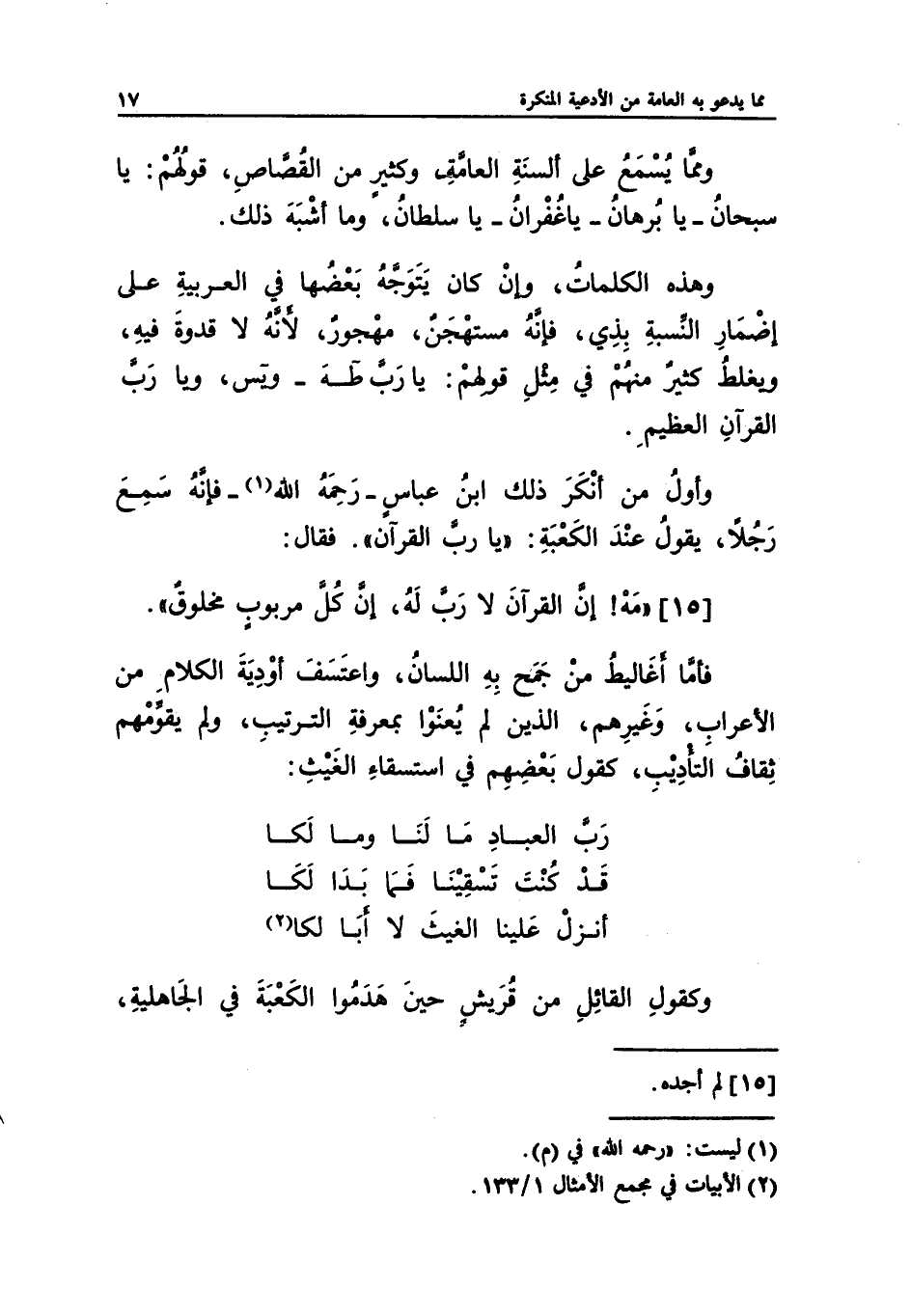 وأولُ من أنْكَرَ ذلك ابنُ عباسٍ -رَحِمَهُ الله (¬1) - فإنهُ سَمِعَ رَجُلاً، يقولُ عنْدَ الكَعْبَةِ: "يا ربَّ القرآن". فقال: