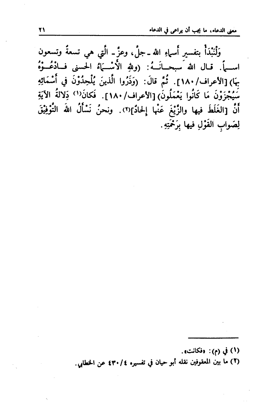 وَلْنَبْدَأ بتفسير أسماءِ الله -جلَّ، وعزَّ- التي هي تسعة وتسعون اسماً. قال الله سبحانَهُ: (وللهِ الأسْمَاءُ الحسنى فادْعُوْهُ بِهَا) [الأعراف/ 180]. ثُم قالَ: (وَذَرُوا الذينَ يُلْحِدُوْنَ في أسْمَائِهِ سَيُجْزَوْنَ مَا كانُوا يَعْمَلُونَ) [الأعراف/ 180]. فَكانَ (¬1) دَلالةُ الآيَةِ أن [الغَلَطَ فيها والزيْغَ عَنْها إلحادٌ] (¬2). ونحنُ نَسْألُ الله التوفيق لِصَوابِ القَوْلِ فيها بِرَحْمتِهِ.
