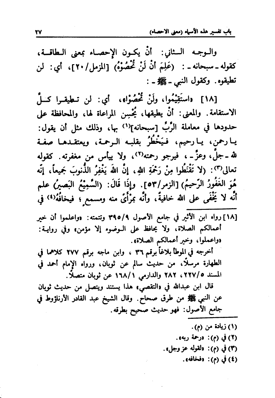 [18] "استَقِيْمُوا، ولَنْ تحصوا"، أي: لن تطيقوا كل الاستقامة. والمعنى: أنْ يطيقها، يُحْسِن المراعاة لها، والمحافظة على حدودها في معاملة الرب [سبحانه] (¬1) بها، وذلك مثل أن يقول: يا رحمن، يا رحيم، فيَخْطُرُ بقلبه الرحمة، ويعتقدها صفة لله -جل، وعز-، فيرجو رحمته (¬2)، ولا ييأس من مغفرته. كقوله تعالى (¬3): (لا تَقْنَطُوا مِنْ رَحْمَةِ اللهِ، إن الله يَغْفِرُ الذنوبَ جَميعاً، إنَه هُوَ الغَفور الرَحيمُ) [الزمر/53]. وإذَا قالَ: (السميعُ البَصير) علم أنه لا يَخْفَى على الله خافيةٌ، وأنه بمرْأىً منه ومسمعٍ؛ فيخافُهُ (¬4) في