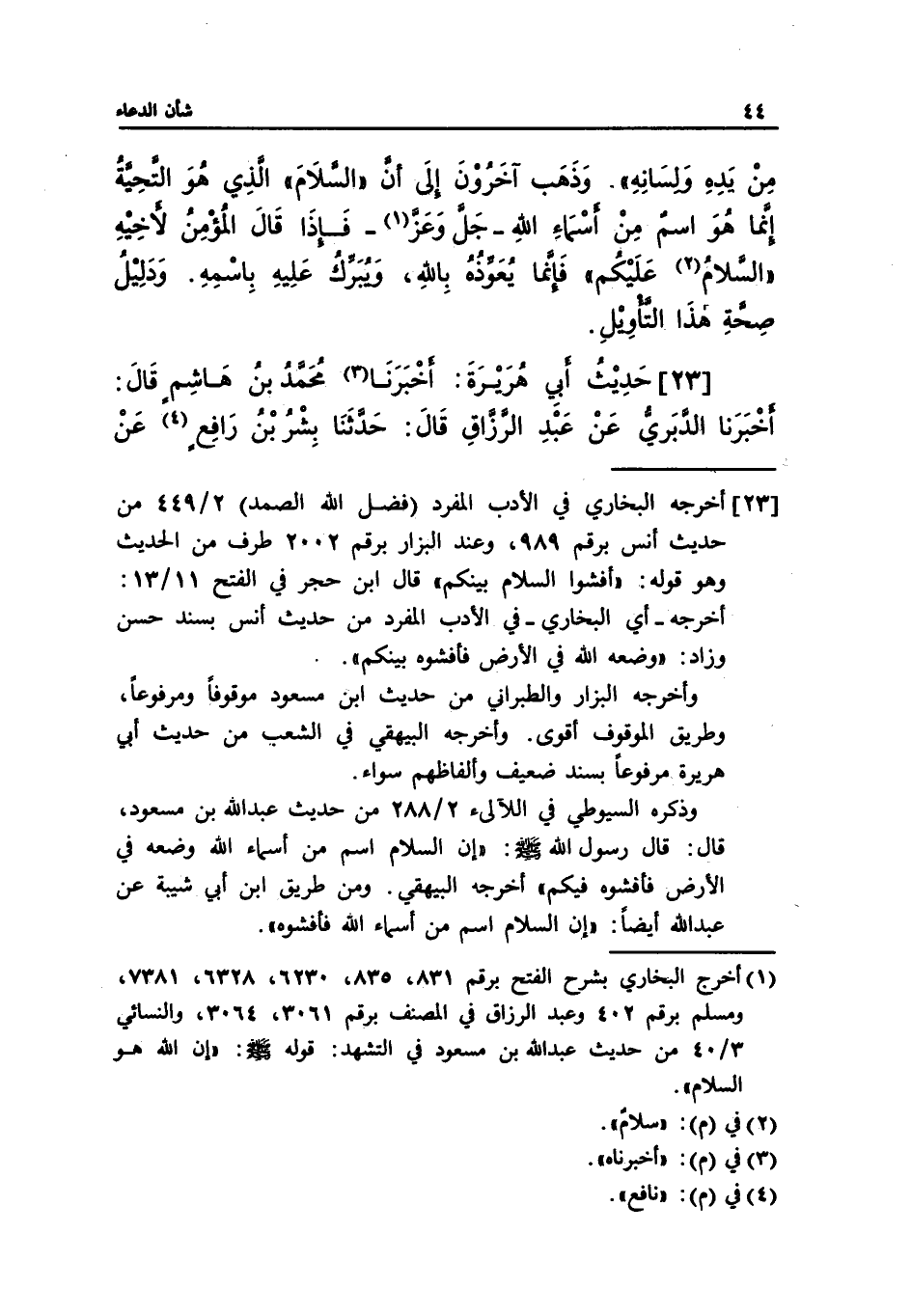 (¬1) أخرج البخاري بشرح الفتح برقم 831، 835، 6230، 6328، 7381، ومسلم برقم 402 وعبد الرزاق في المصنف برقم 3061، 3064، والنسائي 3/ 40 من حديث عبد الله بن مسعود في التشهد: قوله - صلى الله عليه وسلم -: "إن الله هو السلام".