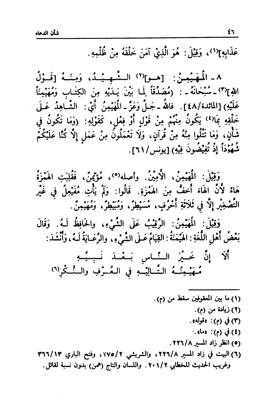 8 - المُهَيْمِنُ: [هو] (¬2) الشهِيْدُ، وَمِنهُ [قَوْلُ اللهِ] (¬3) -سُبْحَانَهُ-: (مُصَدِّقَا لِمَا بينَ يَدَيْهِ مِنَ الكِتَابِ وَمُهَيمِنَاً عَلَيْهِ) [المائدة/48]. فاللهُ -جَل وَعَز- المُهَيْمِنُ أيْ: الشاهِدُ عَلَى خَلْقِهِ بِمَا (¬4) يَكُونُ مِنْهُمْ مِنْ قَوْلٍ أوْ فِعْلٍ، كَقَوْلهِ: (وَمَا تَكُونُ في شَأنٍ، وَمَا تَتْلُوا مِنْهُ مِنْ قُرآنٍ، وَلَا تَعْملُونَ مِنْ عَمَلٍ إلا كُنا عَلَيْكُم شُهُودَا إذْ تُفِيْضُونَ فِيْهِ) [يونس/ 61].
