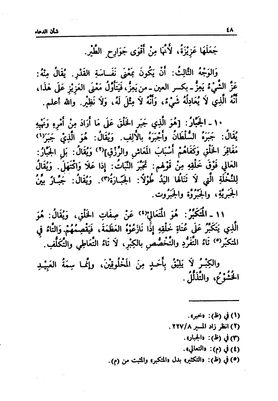 11 - المتكَبر: هُوَ المتعَالِي (¬4) عَنْ صِفَات الخَلْقِ، وَيُقَال: هُوَ الذِي يَتَكَبر عَلَى عُتَاةِ خَلْقِهِ إذَا نَازَعوْهُ العَظَمَةَ، فَيَقْصمُهُمْ وَالتاءُ فِي المتكبر (¬5) تَاءُ التفَرُّدِ والتخْصُّصِ بالكبْرِ، لَا تَاءُ التَّعَاطِي والتَّكَلُّفِ.