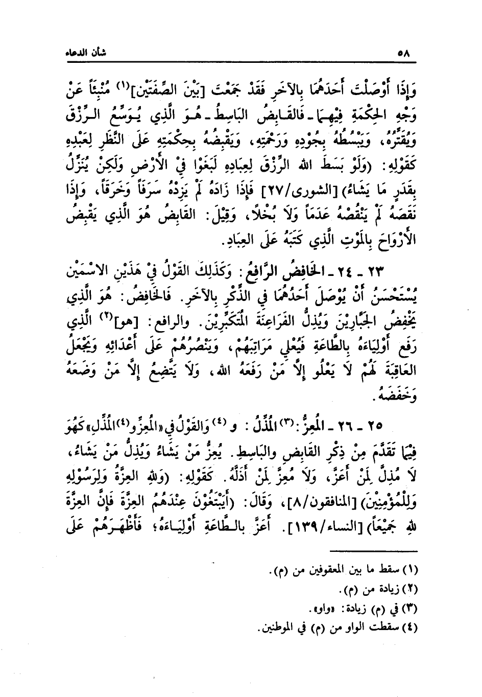 25 - 26 - المُعِزُّ: (¬3) المُذِّلُ: و (¬4) وَالقَوْلُ فِي "المُعِزِّ و (4) المُذِّلِ" كَهُوَ فِيْمَا تَقَدمَ مِنْ ذِكْرِ القَابِضِ والبَاسِطِ. يُعِزُّ مَنْ يَشَاءُ وَيُذِلُّ مَنْ يَشَاءُ، لَا مُذِل لِمَنْ أعَز، وَلاَ مُعِز لِمَنْ أذَلهُ. كَقَوْلِهِ: (وَللهِ العِزةُ وَلرَسوْلهِ وَللْمُؤْمِنينَ) [المنافقون/8]، وَقَالَ: (أيَبْتَغُوْنَ عِنْدَهُمُ العِزةَ فَإن العِزةَ لله جَميْعَا) [النساء/139]. أعَزَ بالطاعَةِ أوْليَاءه؛ فَأظْهَرَهُمْ عَلَى