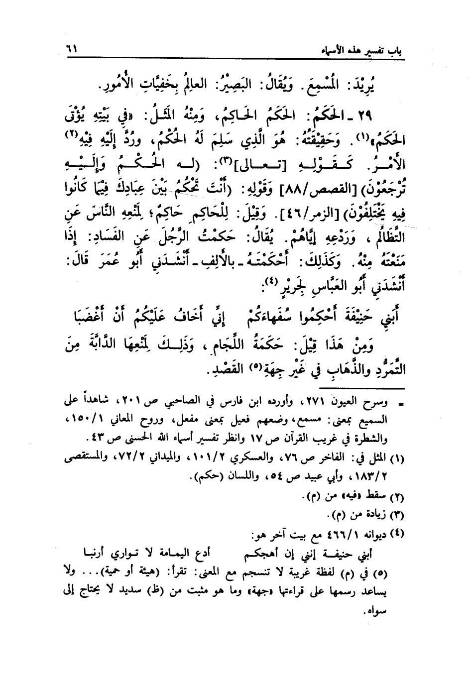 29 - الحَكَمُ: الحَكَمُ الحاكِمُ، ومنه المَثَلُ: "في بَيْتهِ يُؤْتى الحَكَمُ" (¬1). وَحَقِيْقتُهُ: هُوَ الذِي سَلِمَ لَهُ الحُكْمُ، ورد إلَيْهِ فِيْهِ (¬2) الأمْرُ. كَقَوْلهِ [تعالى] (¬3): "له الحُكْمُ وإلَيْهِ تُرْجَعُوْنَ) [القصص/ 88] وَقَوْلهِ: (أنْتَ تَحْكُمُ بين عِبَادكَ فِيْمَا كانوا فِيهِ يَخْتَلِفُوْنَ) [الزمر/ 46]. وَقِيْلَ: لِلْحَاكِمِ حَاكِمٌ؛ لِمَنْعِهِ الناس عَنِ التظَالُم، ورَدْعِهِ إيَّاهُمْ. يُقَالُ: حَكمْتُ الرجُلَ عَن الفَسَادِ: إذَا مَنَعْتَهُ مِنْهُ. وَكذَلِكَ: أحْكَمْتَهُ -بالألِفِ- أنْشدَنِي أبُو عُمَرَ قَالَ: أنْشَدَني أبو العَبَّاسِ لِجَريْرٍ (¬4):