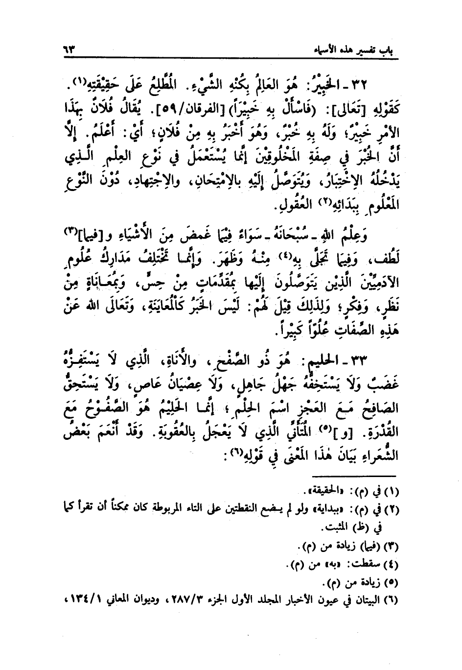 33 - الحليم: هُوَ ذو الصفْحِ، والأنَاةِ، الذِي لَا يسْتَفزْه غَضَبٌ وَلَا يَسْتَخِفُّهُ جَهْلُ جَاهِلٍ، وَلَا عِصيَانُ عَاصٍ، وَلَا يَسْتحِق الصَافِحُ مَعَ العَجز اسمَ الحِلْمِ؛ إنما الحلِيمُ هُوَ الصفُوحُ مَعَ القُدْرَةِ. [و] (¬5) المتأني الذِي لَا يَعجَل بِالعقُوَبةِ. وَقَدْ أنعَمَ بَعْض الشْعَراءِ بَيَانَ هذَا المَعْنَى فِي قَوْلهِ (¬6):