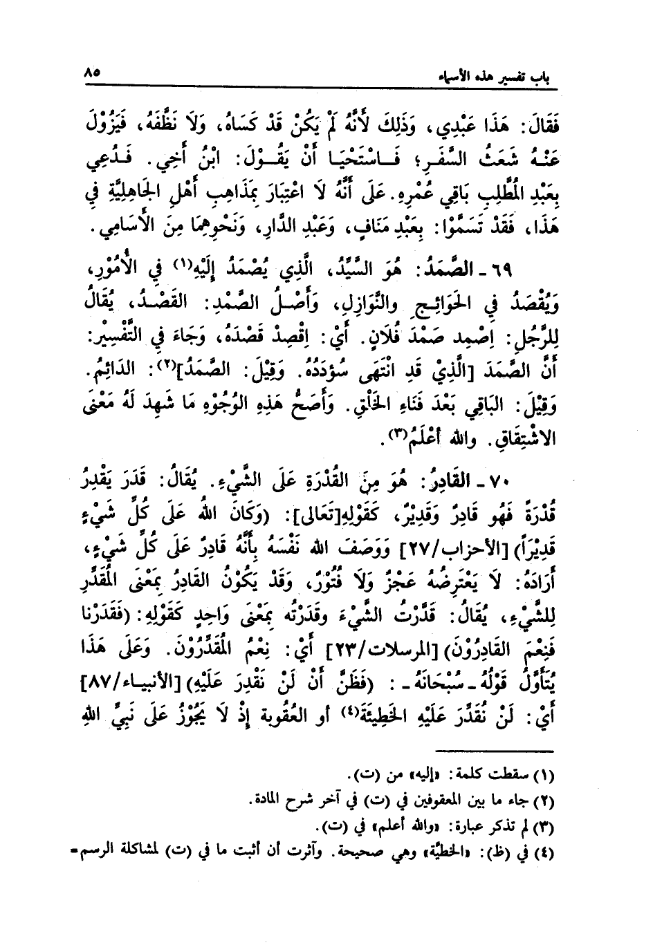 70 - القَادِرُ: هُوَ من القُدْرَةِ عَلَى الشَّيْءِ. يُقَالُ: قَدَرَ يَقْدِرُ قُدْرَةً فَهُو قَادِرٌ وَقَدِيْرٌ، كَقَوْلهِ [تَعَالى]: (وَكَانَ اللهُ عَلَى كُل شَيْء قَدِيراً) [الأحزاب/27] وَوَصَفَ الله نَفْسَهُ بِأنهُ قَادر عَلَى كُل شَيْء، أرَاده: لَا يَعْتَرِضهُ عَجْزٌ وَلَا فُتوْرٌ، وَقَدْ يَكُوْنُ القَادرُ بِمَعْنَى المُقَدِّرِ لِلشيْءِ، يُقَال: قَدرْت الشيْءَ وقَدَرْتُه بِمَعْنَى وَاحِد كَقَوْلهِ: (فقَدَرْنا فَنِعْمَ القَادروْنَ) [المرسلات/23] أيْ: نِعْم المُقَدِّرُوْنَ. وَعَلَى هَذَا يتَأوَّلُ قَوْلُه -سبْحَانَه-: (فَظَن أنْ لَنْ نَقْدِرَ عَلَيْهِ) [الأنبياء/87] أيْ: لَنْ نقَدِّرَ عَلَيْهِ الخَطِيئَةَ (¬4) أو العُقُوبة إذْ لَا يَجُهْزُ عَلَى نَبِي اللهِ
