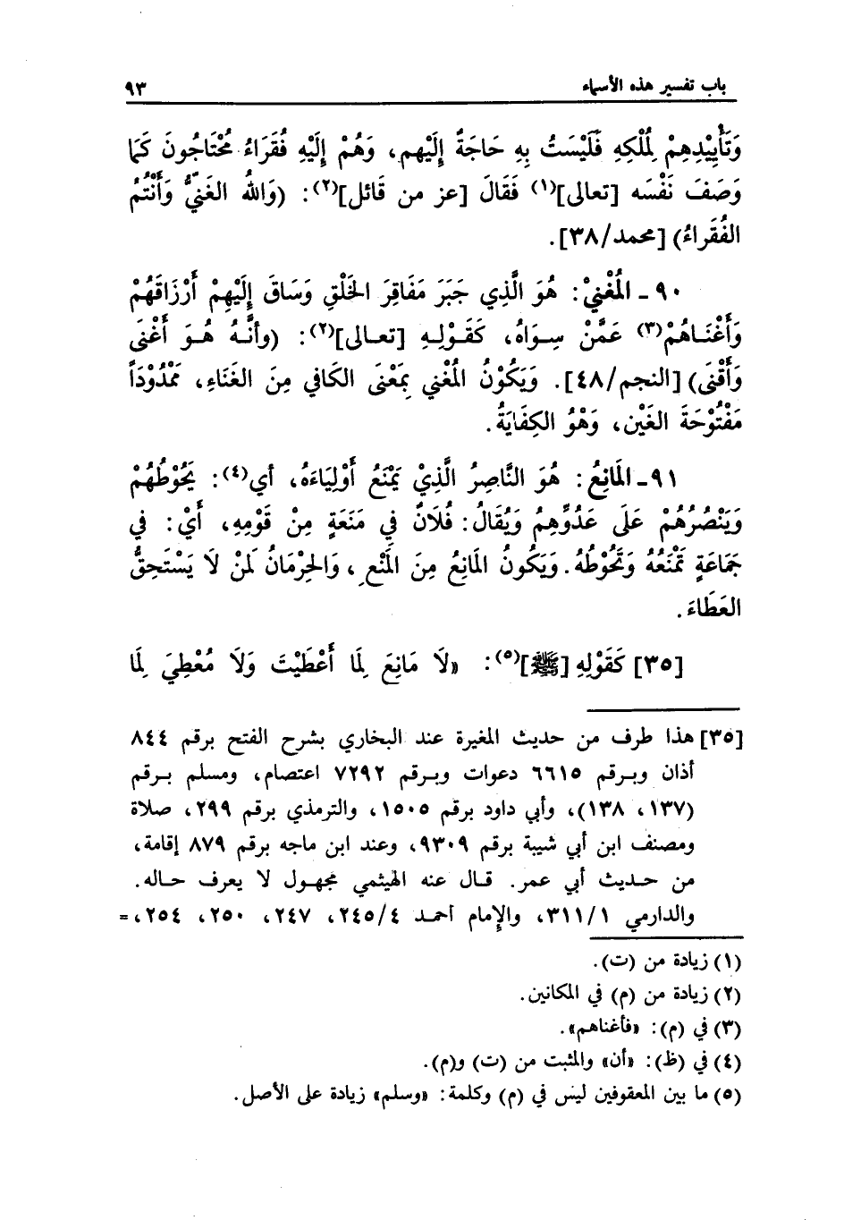 90 - المُغْنيْ: هُوَ الذِي جَبَرَ مَفَاقِرَ الخَلْقِ وَسَاقَ إلَيْهِمْ أرْزَاقَهُمْ وَأغْنَاهُمْ (¬3) عَمَّنْ سِوَاهُ، كَقَوْلهِ [تعالى] (2): (وأنهُ هُوَ أغْنَى وَأقْنَى) [النجم/48]. وَيَكُوْنُ المُغْني بِمَعْنَى الكَافي مِنَ الغَنَاءِ، مَمْدُوْدَاً مَفْتُوْحَةَ الغين، وَهْوُ الكِفَايَة.