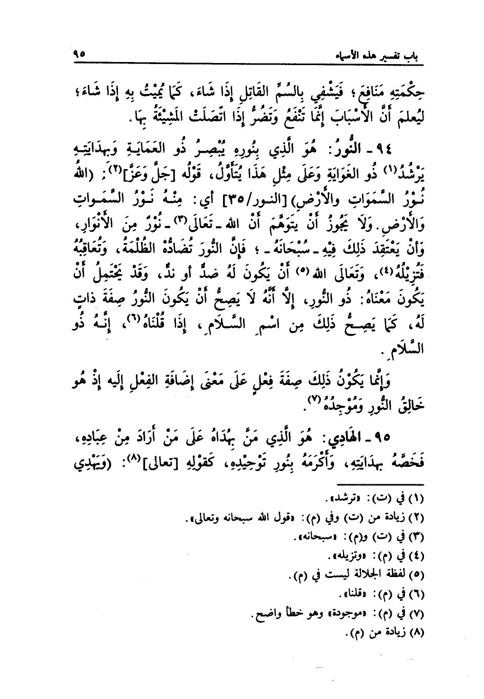 94 - النُّورُ: هُوَ الذِي بِنُورِهِ يُبْصِرُ ذو العَمَايَةِ وَبهدَايتهِ يَرْشُدُ (¬1) ذو الغَوَايَةِ وَعَلَى مِثل هَذَا يُتَأوَّلُ، قَوْلُه [جَل وَعَزَّ] (¬2): (اللهُ نُوْرُ السمَوَاتِ والأرْضِ) [النور/35] أي: مِنْهُ نوْرُ السَّمَواتِ وَالأرْضِ. وَلَا يَجُوزُ أنْ يتَوَهَّمَ أنْ الله -تَعَالَى (¬3) - نُوْرٌ مِنَ الأنْوَار، وأنْ يَعْتَقِدَ ذَلِكَ فِيْهِ -سُبْحَانَهُ-؛ فَإنَّ النورَ تُضَادُّهْ الظُلْمَةُ، وَتُعَاقِبُهُ فَتُزِيْلُهُ (¬4)، وَتَعَالَى الله (¬5) أنْ يَكُونَ لَهُ ضدٌّ أو ندٌّ، وَقَدْ يَحْتَمِلُ أنْ يَكُونَ مَعْنَاهُ: ذو النورِ، إلا أنهُ لَا يصِح أنْ يَكُونَ النورُ صِفَةَ ذاتٍ لَهُ، كَمَا يَصِح ذَلِكَ مِن اسْمِ السلاَمِ، إذَا قُلْنَاهُ (¬6)، إنهُ ذو السلَامَ.
