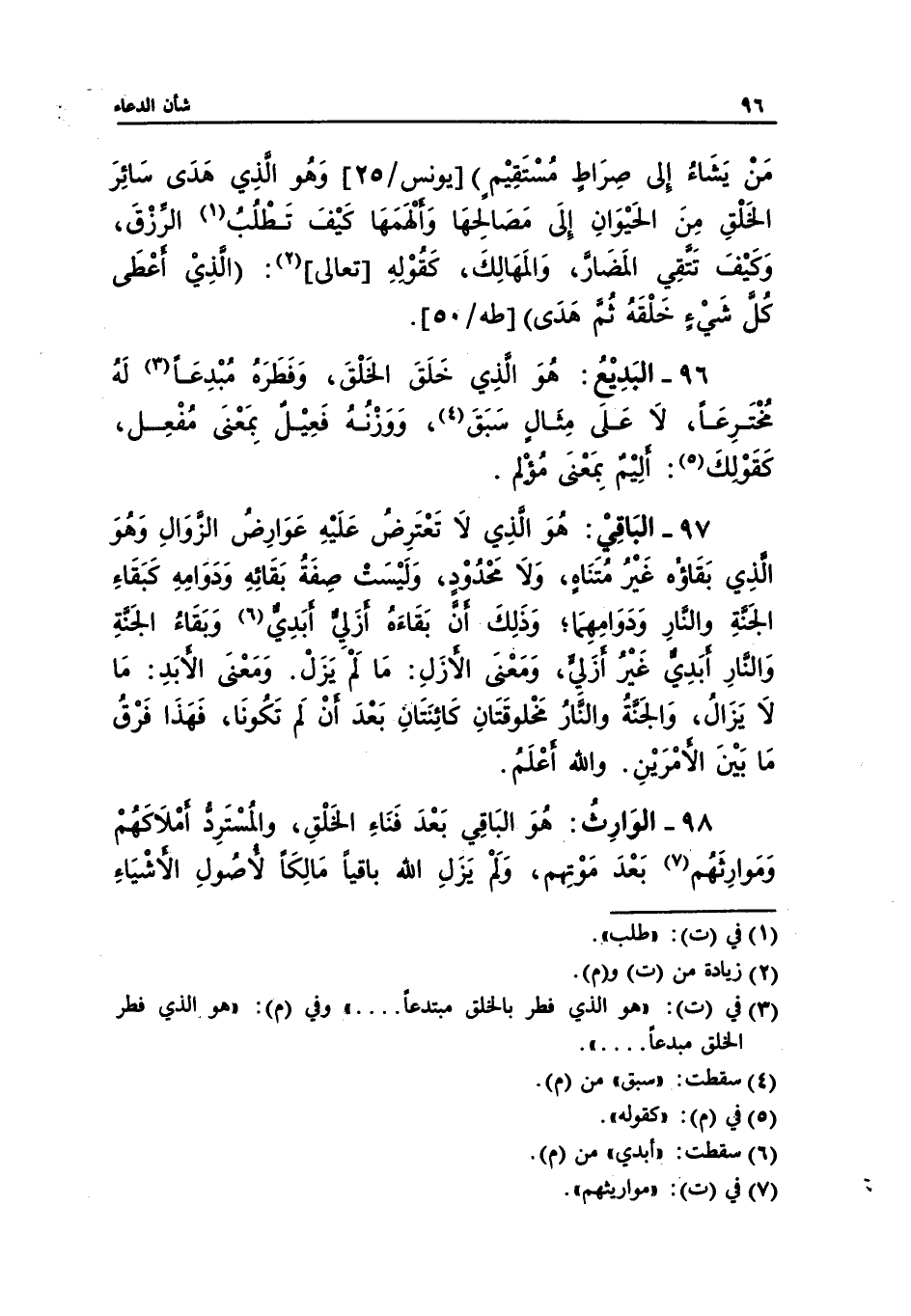 98 - الوَارِثُ: هُوَ البَاقِي بَعْدَ فَنَاءِ الخَلْقِ، والمُسْتَرِدُّ أمْلَاكَهُمْ وَمَوارِثَهُم (¬7) بَعْدَ مَوْتِهم، وَلَمْ يَزَلِ الله باقياً مَالِكَاً لأصُولِ الأشْيَاءِ