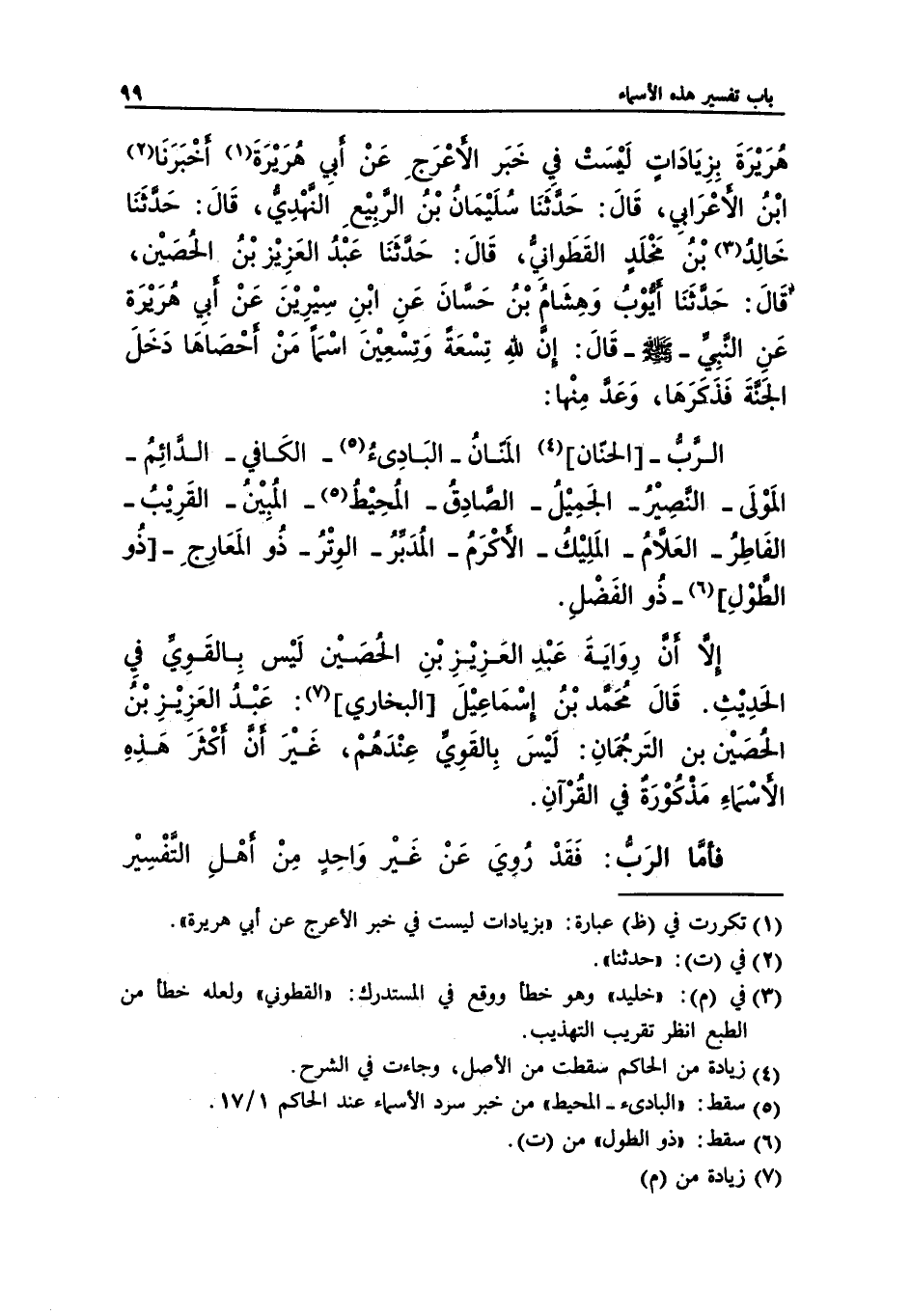 هُرَيْرَةَ بِزِيَادَاتٍ لَيْسَتْ في خَبَر الأعْرَجِ عَنْ أبِي هُرَيْرَةَ (¬1) أخْبَرَنَا (¬2) ابْنُ الأعْرَابي، قَالَ: حَدثَنَا سُلَيْمَانُ بْنُ الرَّبِيْعِ النهْدِيُّ، قَالَ: حَدثَنَا خَالِدُ (¬3) بْنُ مَخْلَدٍ القَطَوانيُّ، قَالَ: حَدثَنَا عَبْدُ العَزِيْز بْنُ الحُصين، قَالَ: حَدثَنَا أيُّوْبُ وَهِشَامُ بْنُ حَسَّانَ عَنِ ابْنِ سِيْرِيْنَ عَنْ أبِي هُرَيْرَة عَنِ النبِي - صلى الله عليه وسلم - قَالَ: إن للهِ تِسْعَة وَتسْعينَ اسْمَاً مَنْ أحْصَاهَا دَخَلَ الجَنةَ فَذَكَرَهَا، وَعَدَّ مِنْها: