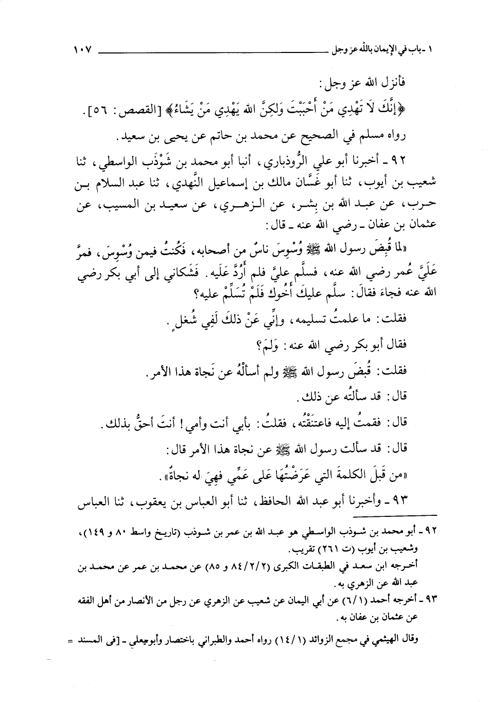 92 - أخبرنا أبو علي الروذباري أنبأ أبو محمد بن شوذب الواسطي ثنا شعيب بن أيوب ثنا أبو غسان مالك بن إسماعيل النهدي ثنا عبد السلام بن حرب عن عبد الله بن بشر عن الزهري عن سعيد بن المسيب عن عثمان بن عفان ـ رضي الله عنه ـ قال : لما قبض رسول الله صلى الله عليه و سلم وسوس ناس من أصحابه فكنت فيمن وسوس فمر علي عمر رضي الله عنه فسلم علي فلم أرد عليه فشكاني إلى أبي بكر رضي الله عنه فجاء فقال : سلم عليك أخوك فلم تسلم عليه ؟