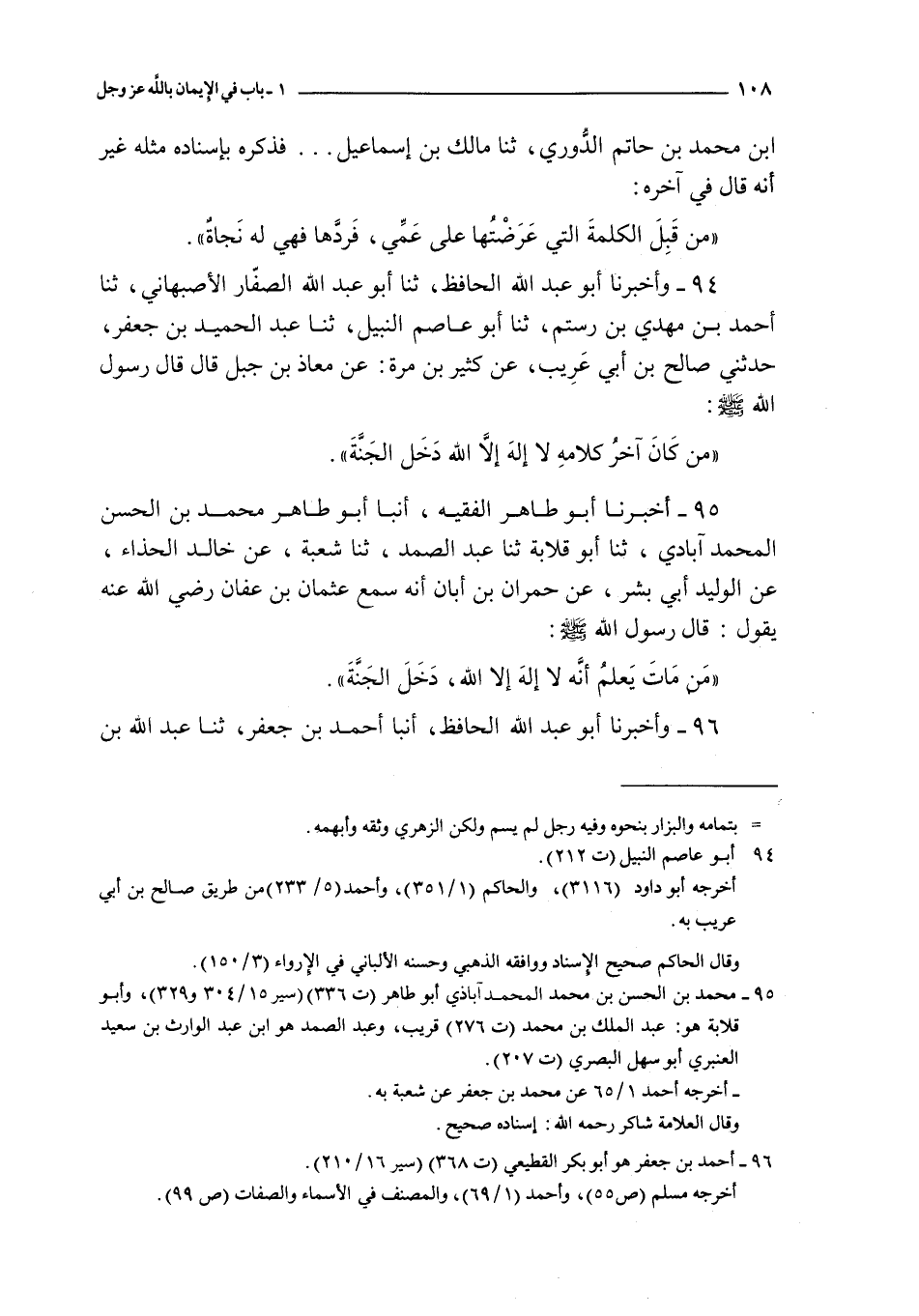 96 - و أخبرنا أبو عبد الله الحافظ أنبأ أحمد بن جعفر ثنا عبد الله بن أحمد بن حنبل حدثني أبي حدثنا إسماعيل بن علية عن خالد : فذكره غير أنه قال :